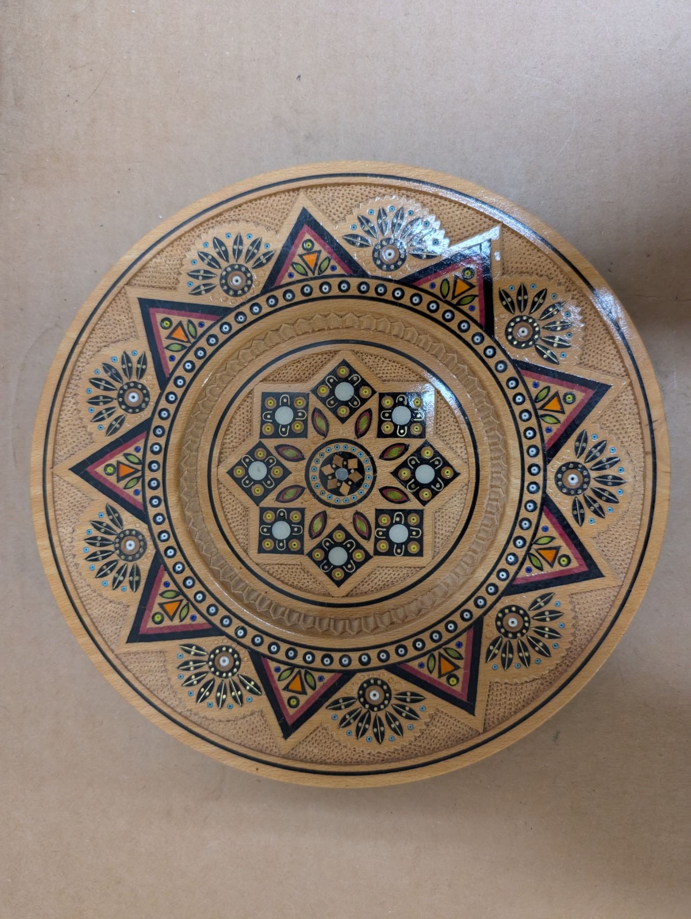 Wooden dish carved in Ukraine. Has attached hook for hanging on wall.