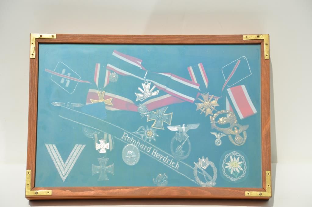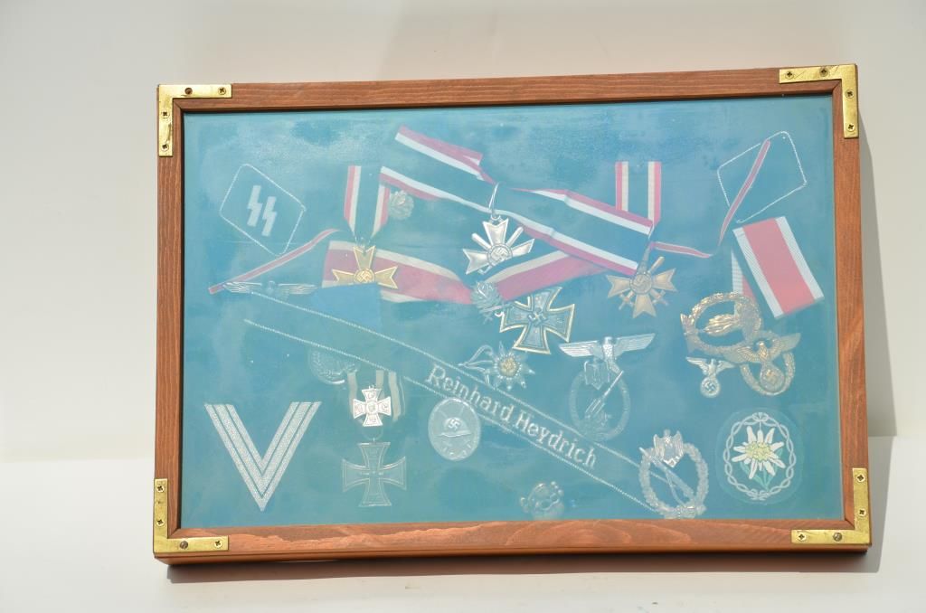 Wooden display case of German nazi medals and ribbons. Est.: $200-$400.