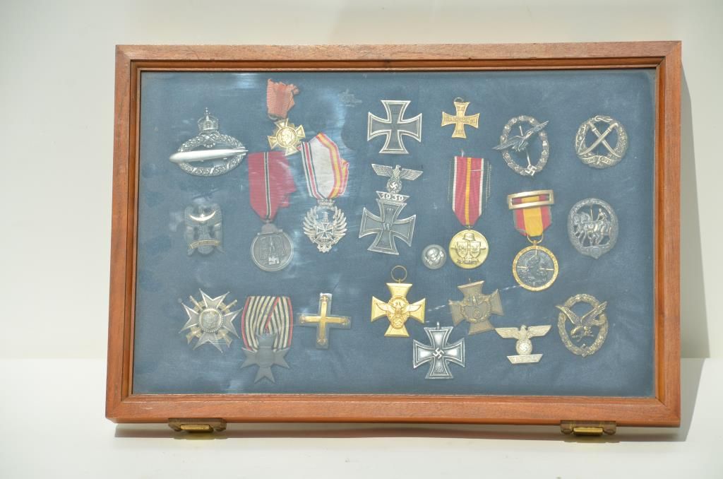 Wooden display case of German nazi medals including iron crosses, Luftwaffe, an interesting balloon medal and others. Est.: $200-$400.