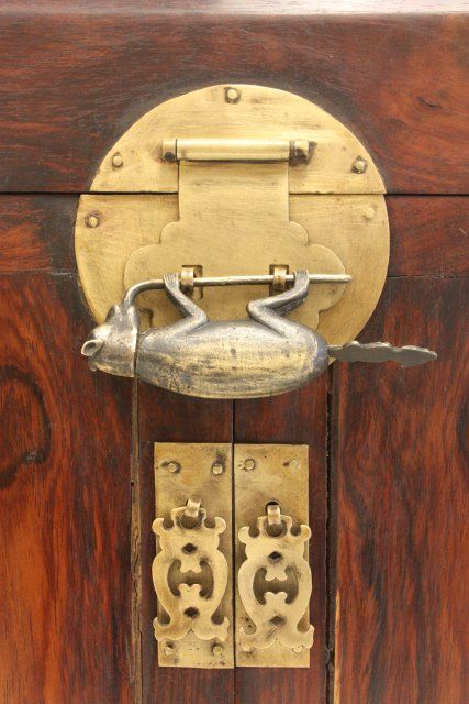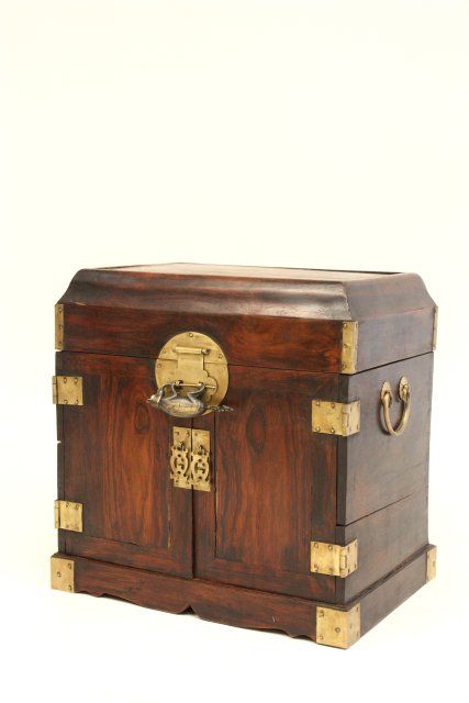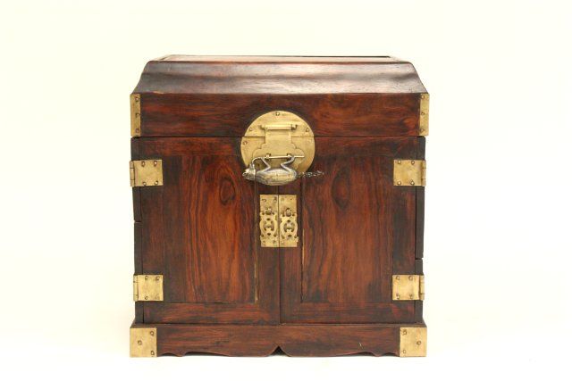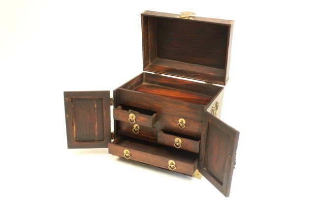 With brass trim & lock, 5 drawer interior. Condition is commensurate with age. Approx. 14" H x 13" W x 9" D. Please read our terms of sale.