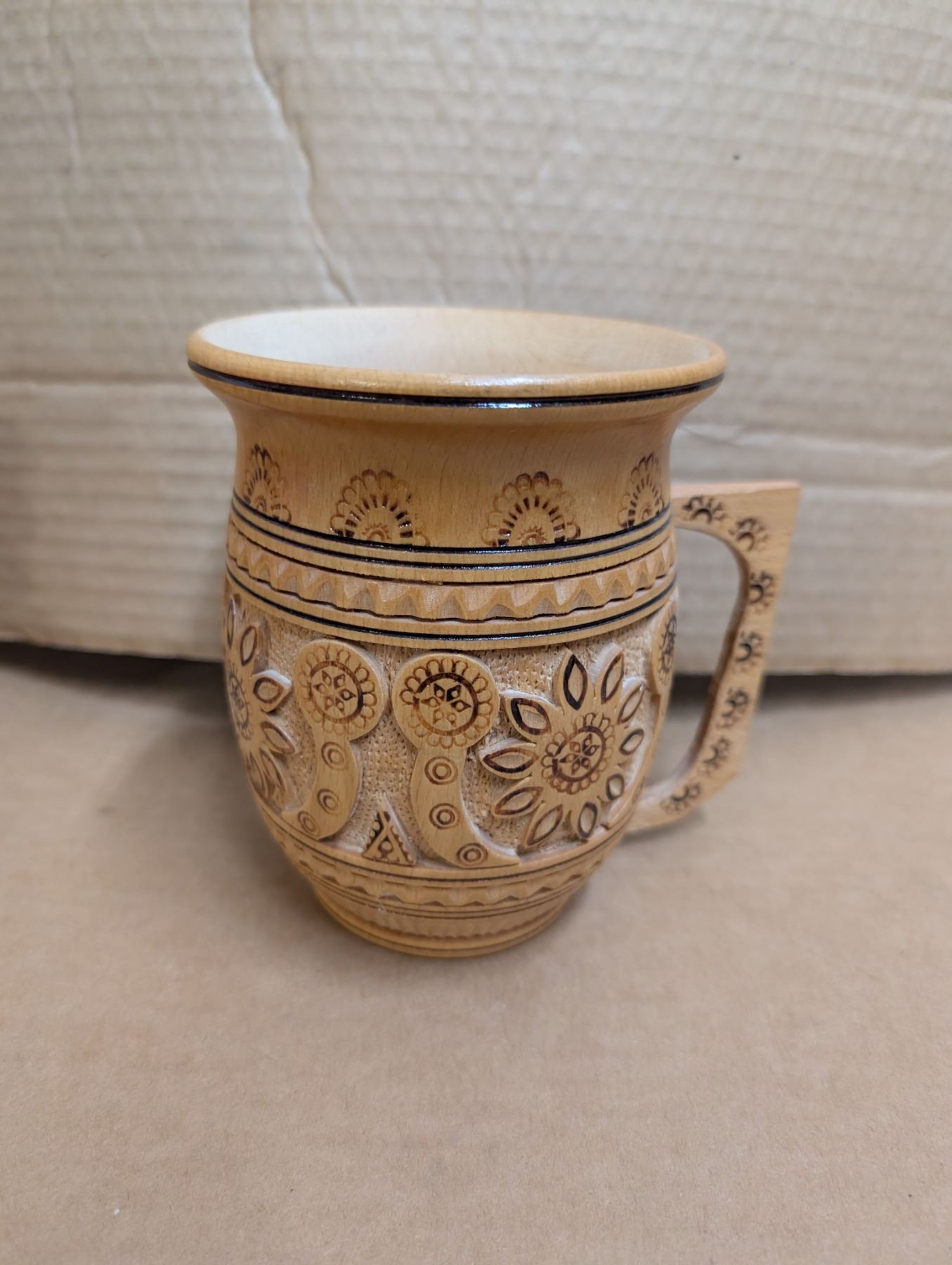 Wooden mug hand carved in Ukraine and artificial pink flowers.