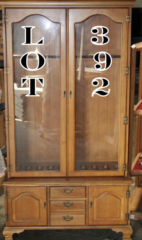 Wooden ten gun rifle cabinet, approx. 74” in height, approx. 40-1/2” wide and approx. 13” deep in overall good condition; upper portion of cabinet is for rifles with two glass doors and the lower section has two centerdrawers for handguns or ammo and two side compartments with wood doors. Est.: $150-$250.