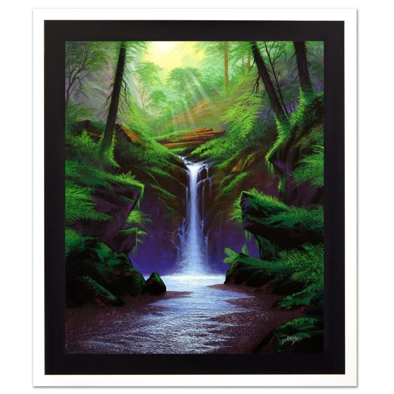 "Woodland Cascade" is a limited edition giclee on canvas by Jon Rattenbury, numbered and hand signed by the artist! Includes Certificate of Authenticity! Measures approx. 20" x 24" (image) with an additional 1.5" black border to allow for a gallery wrap display rather than requiring framing. Please allow 5 additional business for items that include canvas stretch or framing.