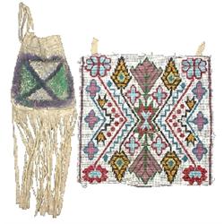 Woodlands Indian-Winnebago loomed panel for shoulder bag, c.1870-80, 9" x 9.5" & Plateau Indian hand painted deerskin belt pouch, c.1930, 12"L.