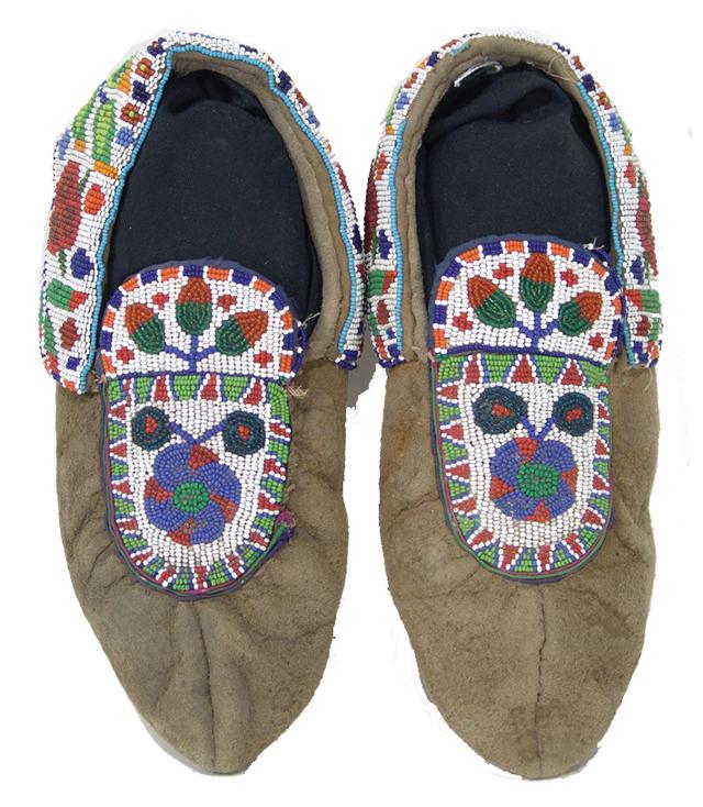 Early/Mid 1900s, Traditional pair of moose hide moccasins with floral beaded ankle flaps and vamps. 10-1/2"