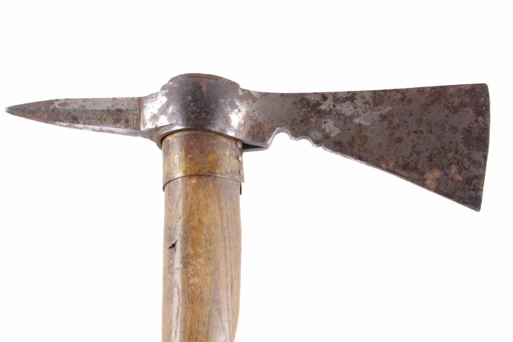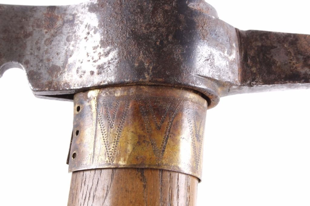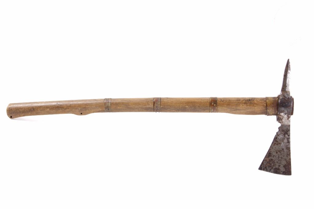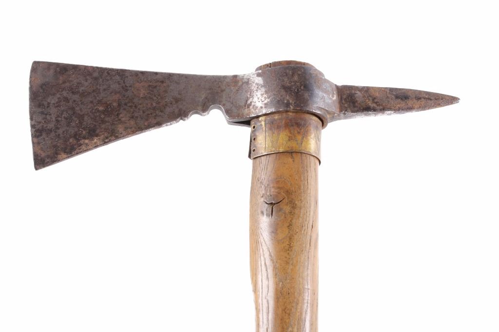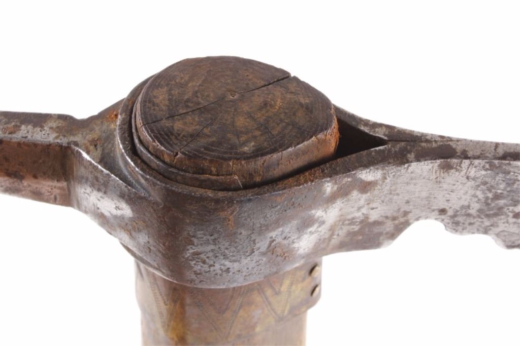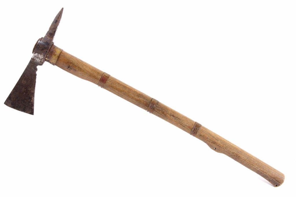 This is an early Woodlands Native American Indian spike tomahawk most likely from the Iroquois or Huron tribes. The exceptional piece dates to the late 18th century to early 19th century and is truly one of the earlier weapons available at this sale. The piece shows an ash wood haft decorated with stipple-engraved copper bands secured with tiny brass nails. The forge iron head is artfully designed showing the period correct style blade and extremely unique spontoon spike like back, making this a very potent edged weapon. The spike back shows two edges. The piece was purchased from a New York Native American antique estate. Provenance: From the personal collection of renowned collector and foremost expert on war clubs and tomahawks, Mark Francis. The Francis collection piece has been authenticated and is truly a museum quality important piece. Measures 21.5"L x 8.75"W with a 2.5'L blade end. The piece has excellent rocker engraved original copper/brass/ inlaid wraps. End is slightly split. Exceptional authentic piece. Mark Francis is the author of the renowned publication, "The Mark Francis Collection of American Indian Art (2009)" and "The Missouri War Axe - War Tomahawk of the Plains and Prairies (2010)".