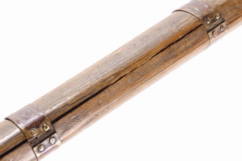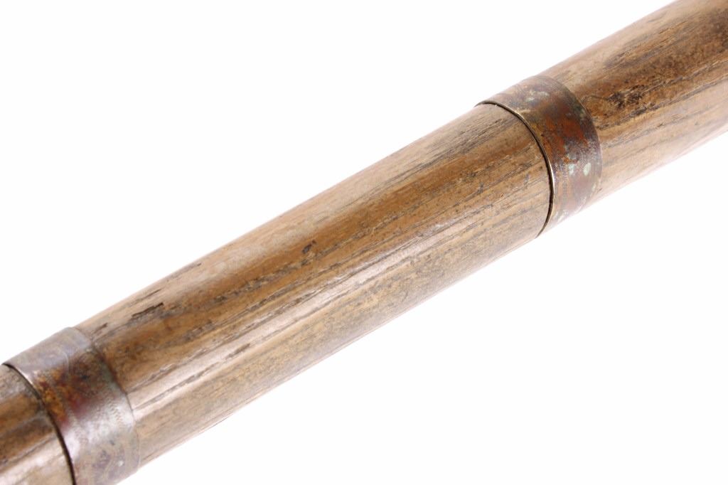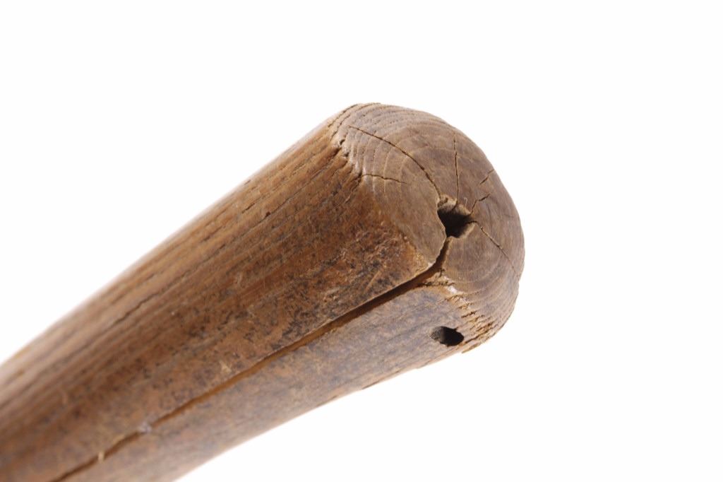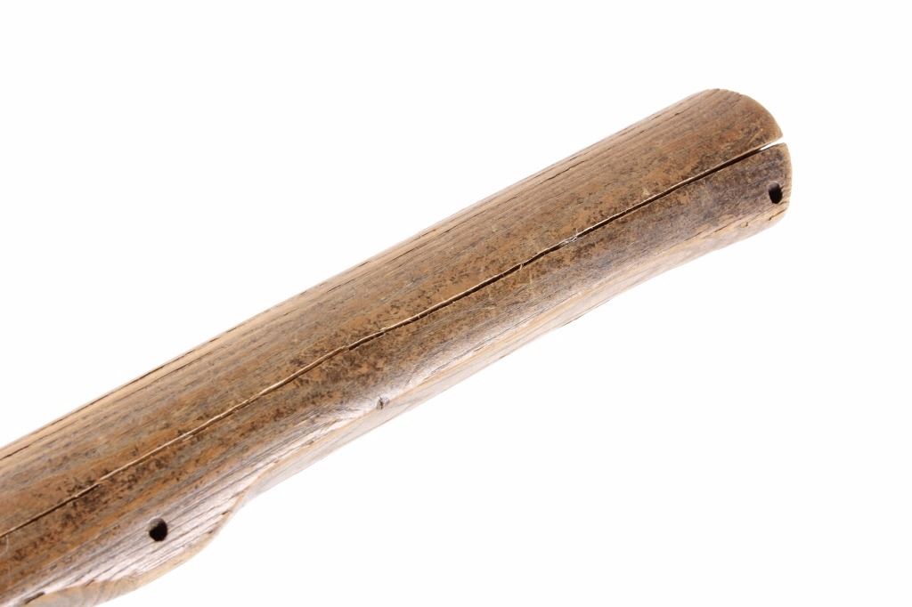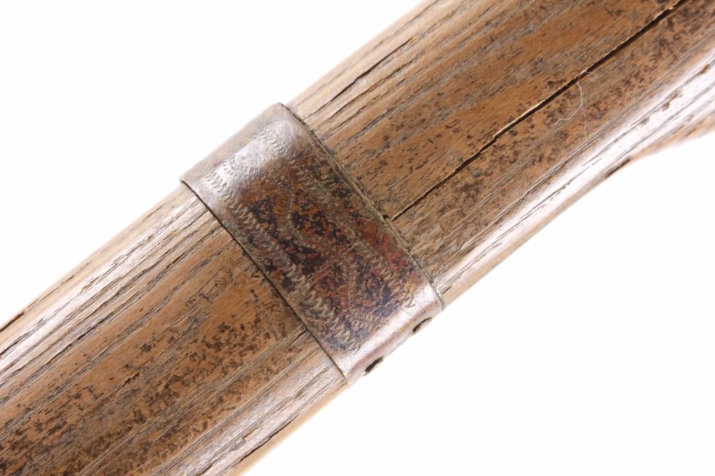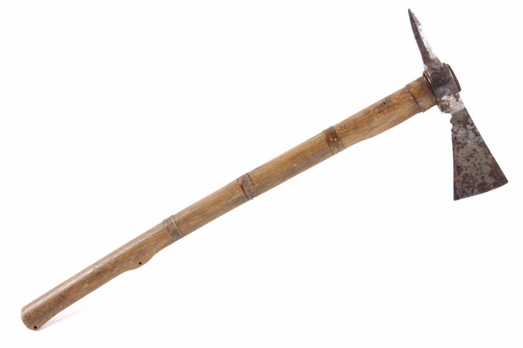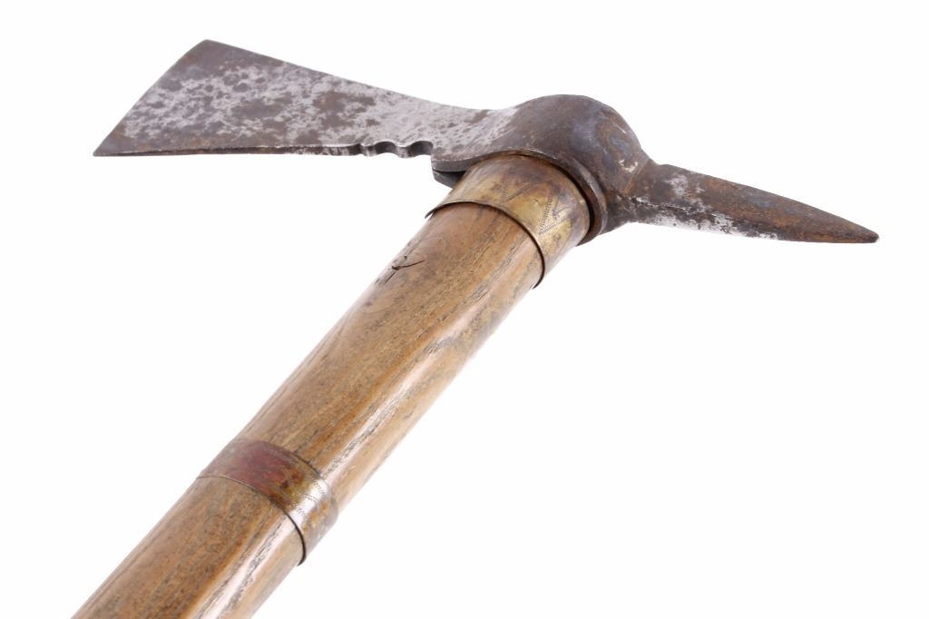 This is an early Woodlands Native American Indian spike tomahawk most likely from the Iroquois or Huron tribes. The exceptional piece dates to the late 18th century to early 19th century and is truly one of the earlier weapons available at this sale. The piece shows an ash wood haft decorated with stipple-engraved copper bands secured with tiny brass nails. The forge iron head is artfully designed showing the period correct style blade and extremely unique spontoon spike like back, making this a very potent edged weapon. The spike back shows two edges. The piece was purchased from a New York Native American antique estate. Provenance: From the personal collection of renowned collector and foremost expert on war clubs and tomahawks, Mark Francis. The Francis collection piece has been authenticated and is truly a museum quality important piece. Measures 21.5"L x 8.75"W with a 2.5'L blade end. The piece has excellent rocker engraved original copper/brass/ inlaid wraps. End is slightly split. Exceptional authentic piece. Mark Francis is the author of the renowned publication, "The Mark Francis Collection of American Indian Art (2009)" and "The Missouri War Axe - War Tomahawk of the Plains and Prairies (2010)".