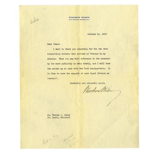 <B>Woodrow Wilson (1856-1924), President, Typed Letter Signed as Governor of New Jersey,</B></I> "<I>Woodrow Wilson</B></I>", one page, 8" x 9.75", Trenton, October 15, 1912 to George S. Johns of St. Louis. Written during his first run for President, Wilson pens: "<I>I want to thank you sincerely for the two very interesting letters that arrived at Trenton in my absence. What you say with reference to the necessity for more publicity is very timely, and I will take the matter up at once with New York headquarters. It is fine to have the support of such loyal friends as yourself.</B></I>" Wilson was in a tight race with both William H. Taft (the Republican) and a rebellious third-party candidate in Theodore Roosevelt (Progressive) running against him. Interestingly, the day before Wilson wrote this letter, Roosevelt was the subject of a failed assassination attempt in Milwaukee while delivering a speech. Showing his usual fortitude, the Bull Moose refused medical treatment and gave his scheduled address with a bullet lodged in his rib. However Roosevelt cancelled the balance of his speaking tour. In a gesture of appropriate concern, both Taft and Wilson suspended their campaign activities until T.R. recovered. Despite these complications, Wilson won the election of 1912, though not with a majority of the popular vote. Light folds, one only slightly affecting end of signature, else fine condition. From the Henry E. Luhrs Collection.