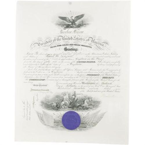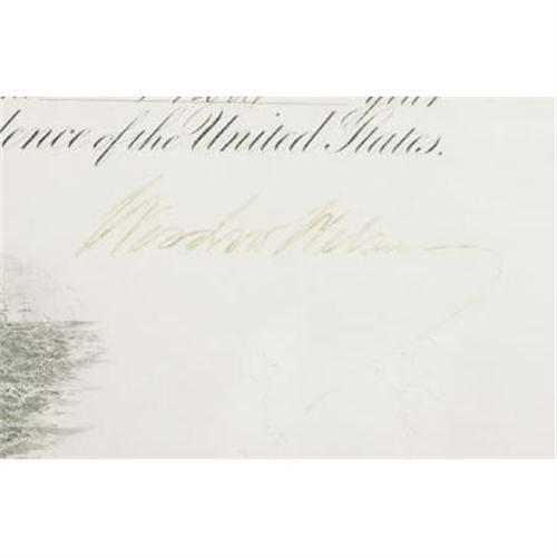 <B>Woodrow Wilson As President Partially Printed Document Signed,</B></I> one page, vellum, 16” x 20”, Washington, D.C., 15.5” x 19”, Washington, D.C., September 13, 1917. Frank H. Schofield is here commissioned a Captain in the U.S. Navy. Countersigned by Secretary of the Navy Josephus Daniels. Engraved with fanciful scene of Neptune and his entourage escorting a semi-nude Columbia over roiling seas. The Wilson signature has faded somewhat, however the document is in excellent condition overall. Schofield, a career officer, would retire as an admiral in 1933. <BR><BR><b>Shipping:</b> Flat Material, Large (<a target="_blank" href="http://www.heritageauctions.com/common/shipping.php">view shipping information</a>)