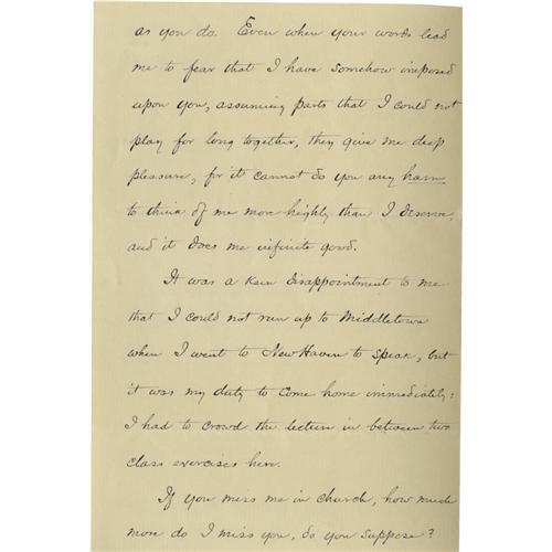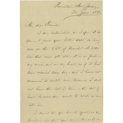 <B> Woodrow Wilson Autograph Letter Signed,</B></I> "<I>Woodrow Wilson</B></I>". Two pages, 5.0" x 7.5", Princeton, New Jersey, June 20, 1891 to an anonymous recipient. This letter was written during Wilson's first year as a Princeton University professor. It is entirely possible that the future President of the United States was corresponding here with his former minister in Middletown, Connecticut. It partially reads: "<I>....If you miss me in church, how much more do I miss you, do you suppose...You can take selected texts and make them, each contributing its own note, speak a meaning whole...we have enjoyed our first season in Princeton. We have a pleasant home and have made many delightful friends...</B></I>". Expected pair of folds, else Very Fine condition.