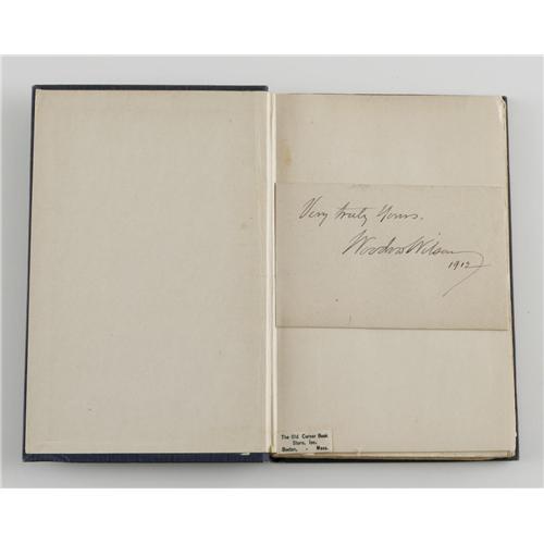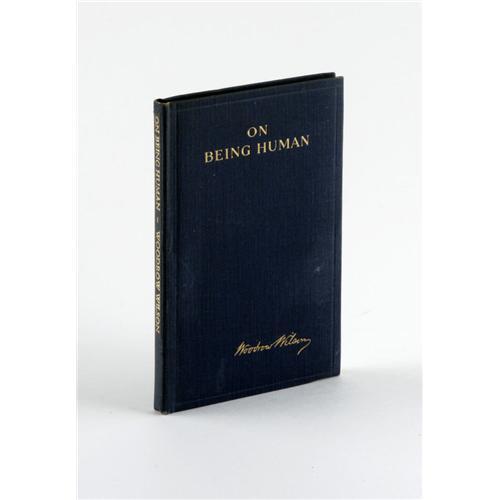 <B>Woodrow Wilson Book Signed: <I>On Being Human</B></I></B></I> (New York: Harper & Brothers, 1897), first edition, 55 pages, blue cloth with gilt lettering on cover and spine, 12mo (4.75" x 7"), signed "<I>Very truly yours, Woodrow Wilson 1912</B></I>" on a card laid down to the front free endpaper. When this book was written, Wilson was a professor at Princeton. This book is his philosophical essay on what makes a person "human." The essay underlines the necessity for everyone in the modern world to embrace humane behavior. Fine copy.