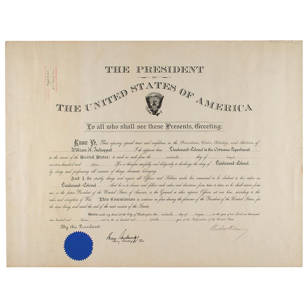 World War I-dated partly-printed DS as president, one page, 21 x 16, August 19, 1915. President Wilson appoints William H. Tschappat as a "Lieutenant-Colonel in the Ordnance Department in the service of the United States." Signed at the conclusion by Woodrow Wilson, and countersigned by Acting Secretary of War Henry Breckinridge. The blue War Office seal remains affixed to the lower left. In fine condition, with light creasing to the side edges. Major General William H. Tschappat (1874–1955) was a career officer in the United States Army and served as the 14th Chief of Ordnance for the U.S. Army Ordnance Corps.