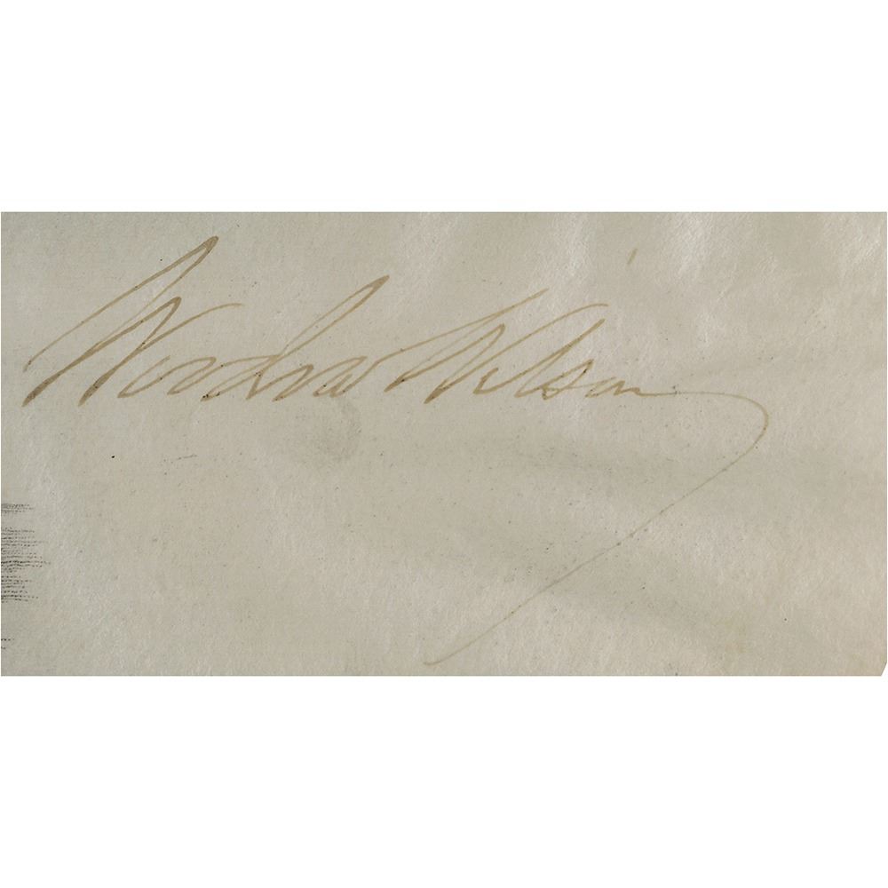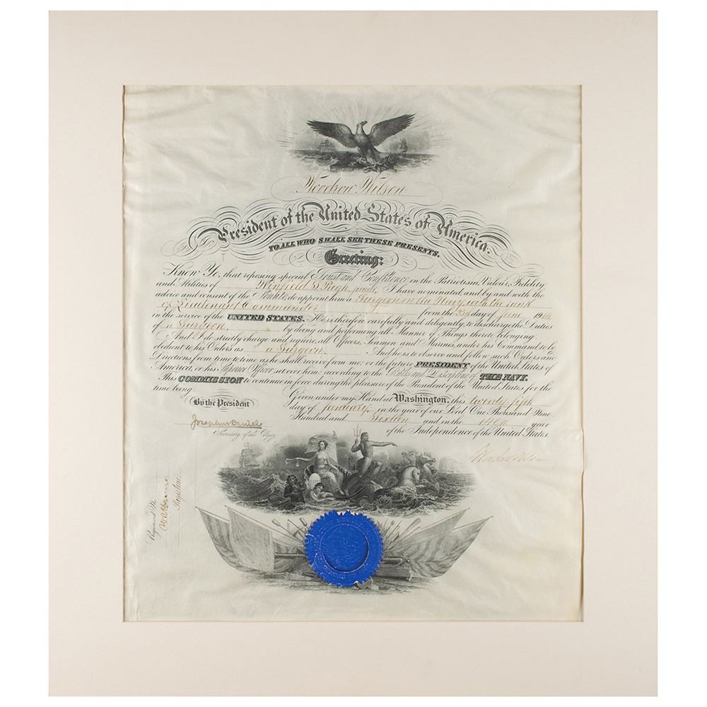 World War I-dated partly-printed vellum DS, one page, 15.5 x 19.25, January 25, 1916. President Wilson appoints Winfield S. Pugh, Jr., as a "Surgeon in the Navy, with the rank of Lieutenant Commander." Signed at the conclusion by Woodrow Wilson, and countersigned by Secretary of the Navy Josephus Daniels. The blue Navy Department seal remains affixed to the lower vignette. Matted to an overall size of 20.5 x 23. In very good to fine condition, with overall wrinkling and rippling, the signature several shades light, and the blue seal torn and lifting from document.