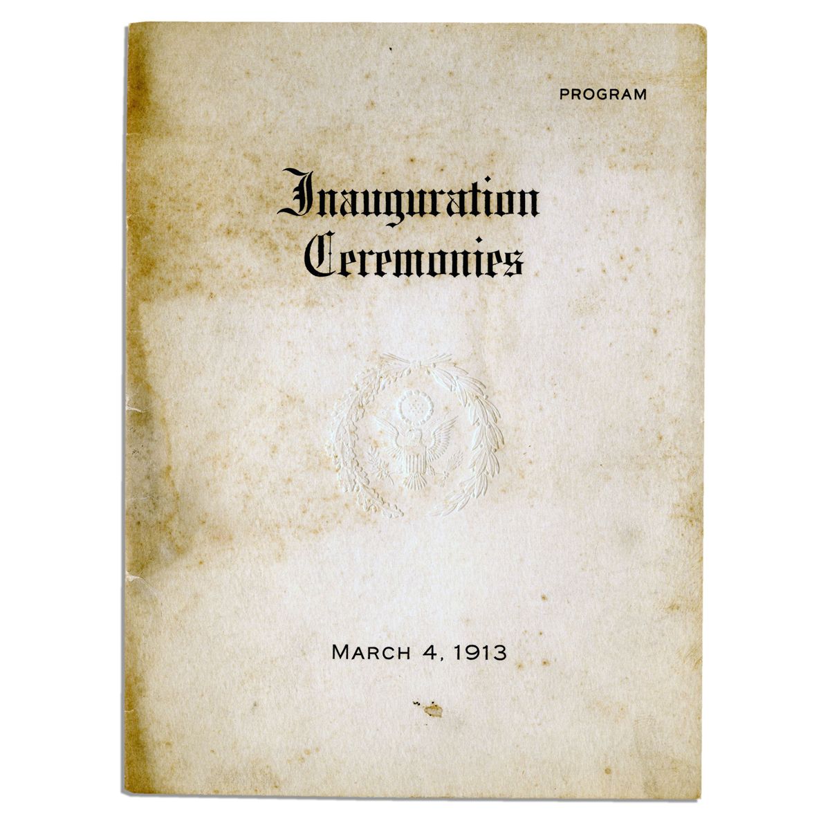 ''Program of the Ceremonies Attending the Inauguration of the President and Vice President of the United States'' from 4 March 1913. The eight-page booklet contains instructions for ticket holders on inauguration day. Woodrow Wilson and Thomas Marshall are not mentioned by name, but referred to throughout the program as ''President-elect'' and ''Vice President-elect''. Soiling and foxing to cover which is separated from pages. Very good.