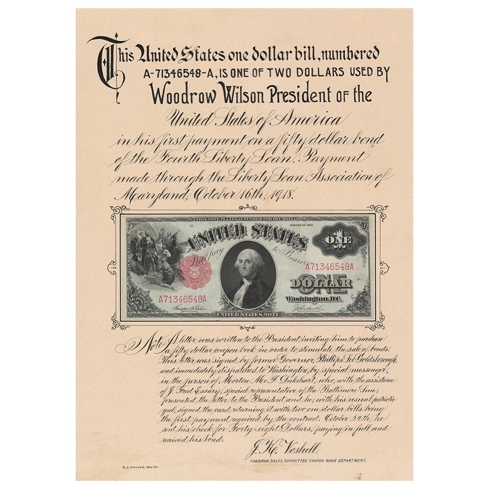 Entirely rare United States Series of 1917 one dollar bill personally used by President Woodrow Wilson, applied by its upper edge to a presentation sheet prepared by noted Baltimore penman and engrosser Samuel Curtis Malone, 10 x 14.25, which reads: ‰ÛÏThis United States one dollar bill, numbered A-71346548-A, is one of two dollars used by Woodrow Wilson President of the United States of America, in his first payment on a fifty dollar bond of the Fourth Liberty Loan Payment made through the Liberty Loan Association of Maryland, October 16th, 1918.‰Û A detailed explanation of Wilson‰Ûªs involvement is penned neatly in the lower section: ‰ÛÏA letter was written to the President inviting him to purchase a fifty dollar coupon book in order to stimulate the sale of bonds. This letter was signed by former Governor Phillips Lee Goldsborogh and immediately dispatched to Washington by special messenger, in the person of Morton McL Dukeheart, who, with the assistance of J. Fred Essary, special representative of the Baltimore Sun, presented the letter to the President and he, with his usual patriotic zeal, signed the card returning it with two one dollar bills being the first payment required by the contract. October 24th, he sent his check for Forty-eight Dollars, paying in full and received his bond.‰Û In fine condition.