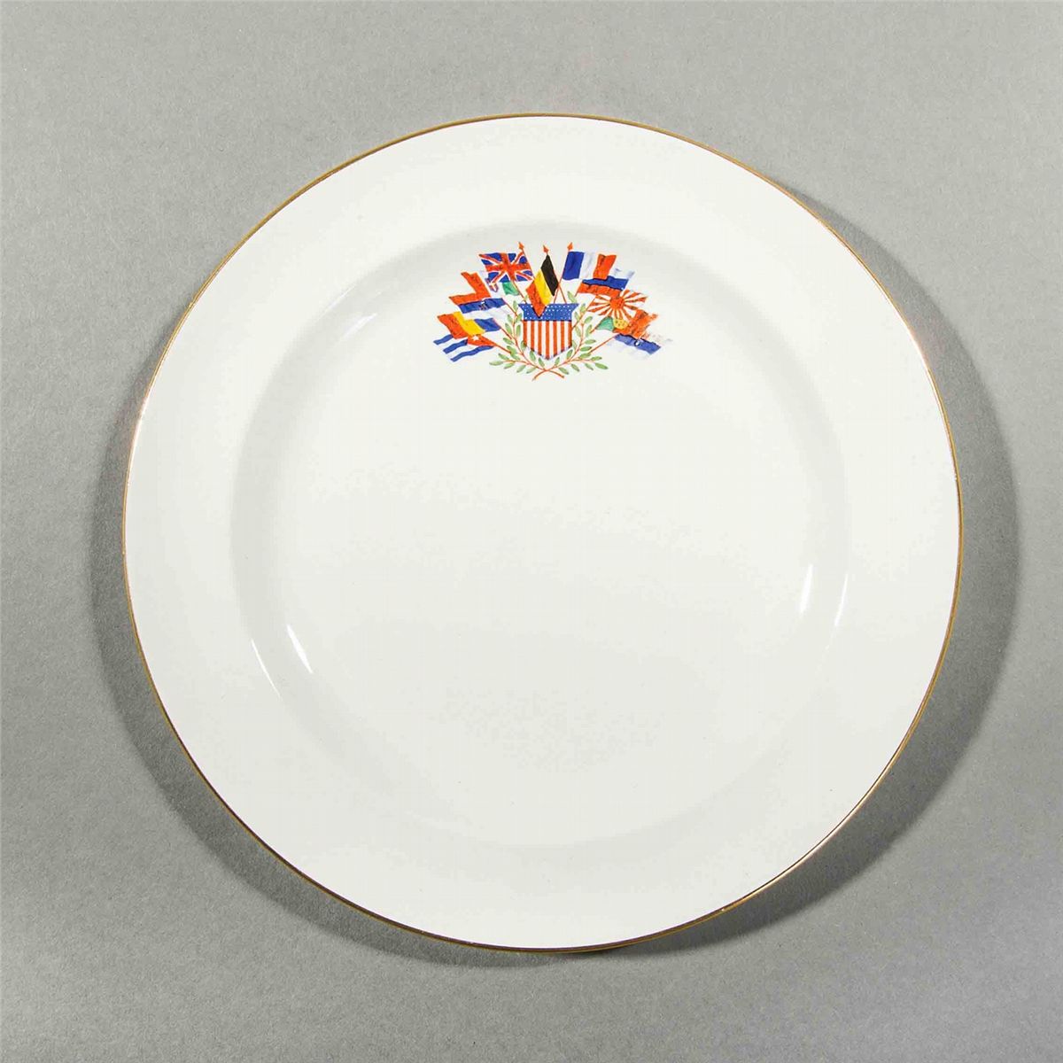 President Wilson’s personally-owned Wedgwood Queen's Ware Liberty China plate. Plate measures 8? in diameter, The pattern, designed by Mrs. Lillian Taylor, contains the shield of the United States flanked by the flags of 11 Allied nations. Reverse bears several impressed markings. In fine condition. These pieces were a private order and were never advertised or sold to the public. Select clientele who ordered and received Liberty China included President Woodrow Wilson, former President Theodore Roosevelt, and Great Britain’s King George V and Queen Mary. Such a plate is illustrated in American Presidential China, a book featuring the well-known collection of Robert McNeil. The McNeil Collection has since been donated to the Philadelphia Museum of Art.