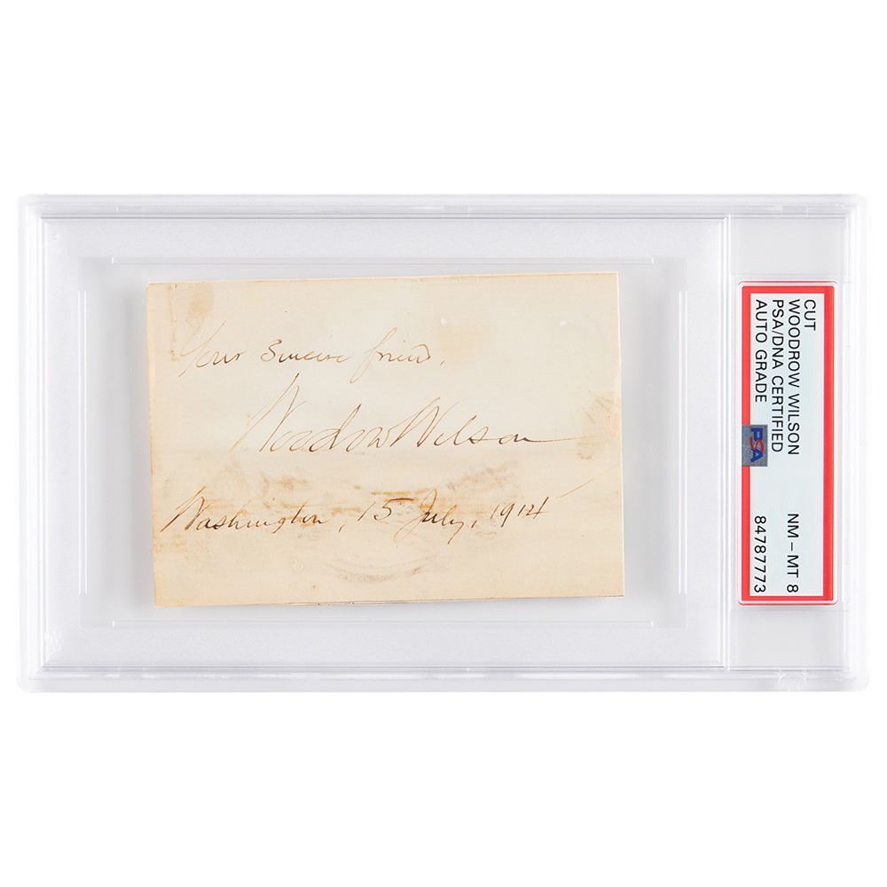 Ink signature as president, "Your sincere friend, Woodrow Wilson, Washington, 15 July, 1914,& rdquo; on an off-white 4 x 2.75 slip. In very good condition, with staining, toning, and wrinkling from mounting remnants on the back. Encapsulated and graded by PSA/DNA as "NM-MT 8."