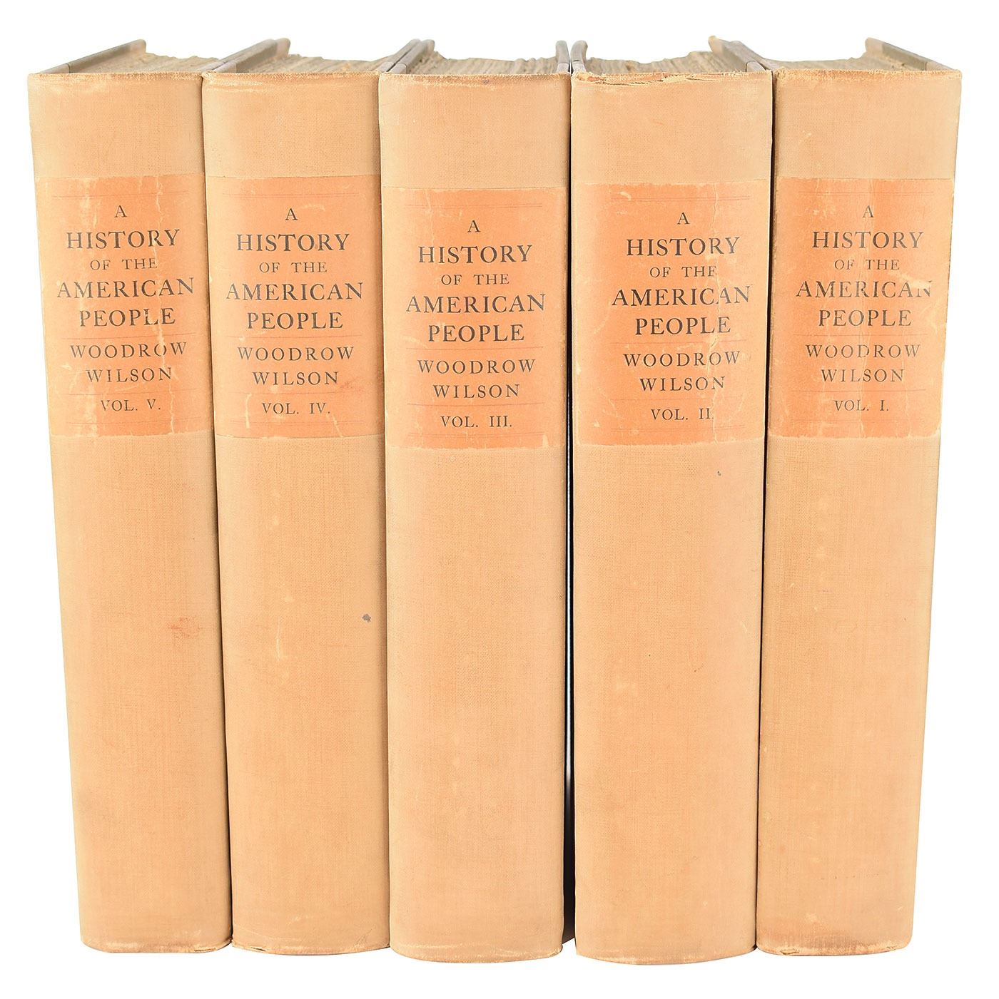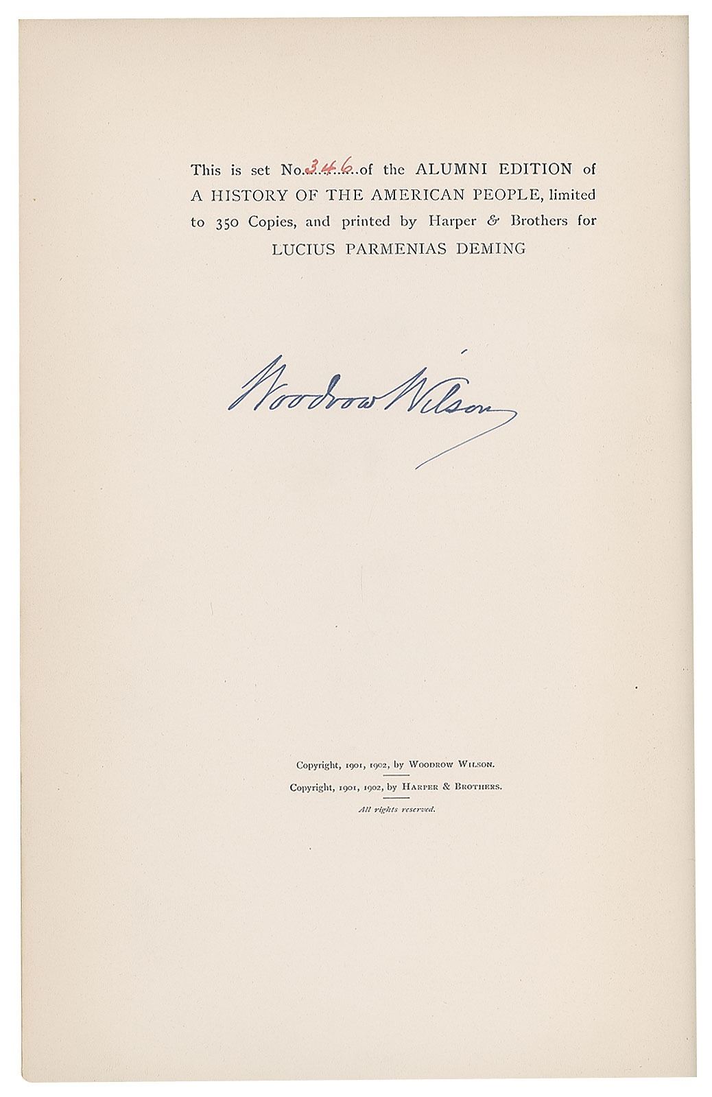 Signed book set: A History of the American People, Volumes I–V. Alumni edition, limited issue, numbered 346/350. NY: Harper & Brothers, 1902. Hardcover, 7 x 10.25, 350 pages. Neatly signed on the colophon of the first volume in fountain pen, "Woodrow Wilson." Autographic condition: fine. Book condition: VG/None, with light to moderate soiling to exteriors, creasing and chips to paper spine labels, and a "Library of Lawrence E. Miller" blindstamp to rear pages.
