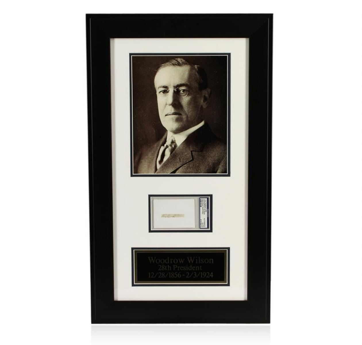 A one of a kind display featuring the autograph of President Woodrow Wilson showcased in a beautiful custom matted display that features a photo of President Wilson. The signature is authenticated and encapsulated by PSA. Thomas Woodrow Wilson (December 28, 1856 - February 3, 1924) was an American politician and academic who served as the 28th President of the United States from 1913 to 1921. This piece comes framed and ready to hang! Dimensions: 15.5" x 27". PSA Certified.