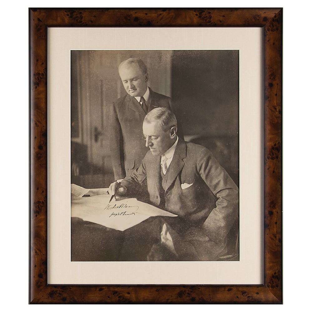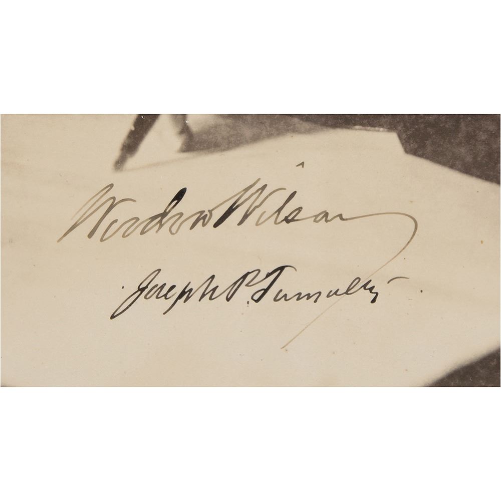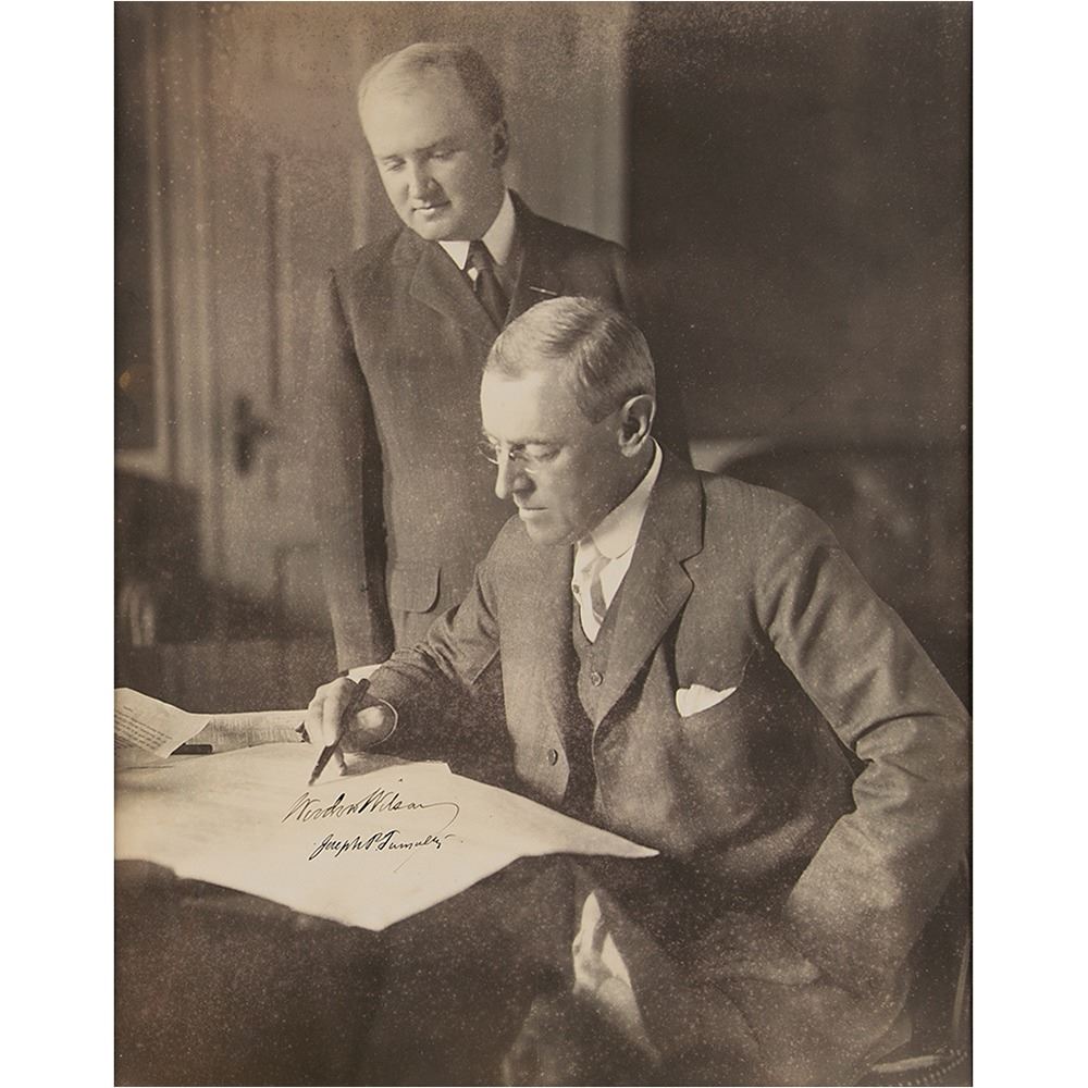 Huge matte-finish 13.25 x 17 photo of President Wilson signing a document with his private secretary Joseph Patrick Tumulty by his side, signed in fountain pen by both, "Woodrow Wilson" and "Joseph P. Tumulty." Attractively cloth-matted and framed to an overall size of 20.25 x 23.75. In very good to fine condition, with speckled discoloration, and some light silvering, to the image.