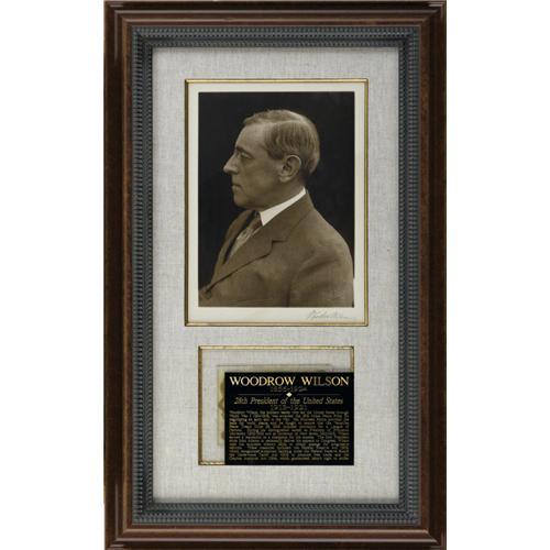<B>Woodrow Wilson Signed Photo.</B></I> A 9.75" x 13.25" B&W Pach Bros. matte finish photograph signed "<I>Woodrow Wilson</B></I>." Woodrow Wilson (1856-1924) was elected President on November 5, 1912, beating out incumbent Republican President William H. Taft and former President and Progressive Party candidate Theodore Roosevelt. Wilson, whose only previous elected office had been Governor of New Jersey, served until March 3, 1921. The first president to hold a doctoral degree, he was the second president to win the Nobel Peace Prize (the first had been awarded to Theodore Roosevelt). There are a few very light creases on the right border of this vintage studio photo, visible only upon close inspection and mentioned only for accuracy. The photograph presents one of the most impressive of all images known of President Wilson. Elaborately matted with fillets and framed to an overall size of 18.75" x 30".