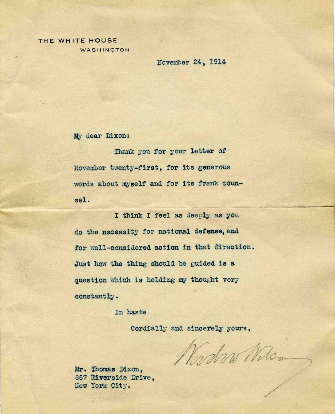 Woodrow Wilson typed letter signed as President, on official White House letterhead, dated 24 November 1914, just months after the Great War erupted. Letter is a response to novelist and segregationalist Thomas Dixon on the subject of national defense and the imminence of greater American involvement in World War I. Wilson's language is eerily premonitory as he writes, ''My dear Dixon: Thank you for your letter of November twenty-first, for its generous words about myself and for its frank counsel. I think I feel as deeply as you do the necessity for national defense, and for well considered action in that direction. Just how the thing should be guided is a question which is holding my thought very constantly. In haste / Cordially and sincerely yours, Woodrow Wilson''. Letter, measuring 7'' x 9'', has a single horizontal fold and faint creases at each corner, else fine condition. Includes official 7.25'' x 4.5'' White House envelope with 2c postage. Unlike letter, envelope has significant toning throughout.