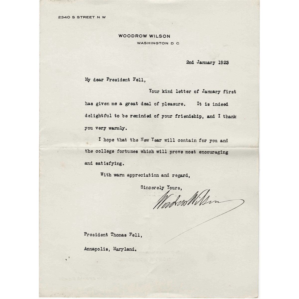 Woodrow Wilson typed letter signed on his personal Washington, DC letterhead. Dated 2 January 1923, letter to St. Johns College President Thomas Fell in Annapolis, Maryland reads in part, ''…It is indeed delightful to be reminded of your friendship…I hope that the New Year will contain for you and the college fortunes which will prove most encouraging and satisfying…'' 7'' x 9.5'' single-page letter on folded stationery. Bold signature; overall very good condition.