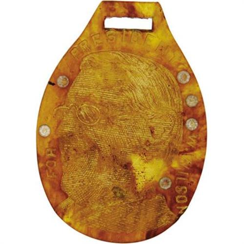 <B>Woodrow Wilson Tortoise Shell Watch Fob,</B></I> 1.5" x 2", 1912 or 1916. This thin slice of shell carries a smiling bust of Woodrow Wilson surrounded by five stars and "For President W. Wilson". The verso is stamped "18 K. Gold Inlaid". Intact, with very few signs of wear. Excellent condition. An unusual piece made from a material long banned from the marketplace.<BR><BR><b>Shipping:</b> Miscellaneous Collectibles, Smal (<a target="_blank" href="http://www.heritageauctions.com/common/shipping.php">view shipping information</a>)