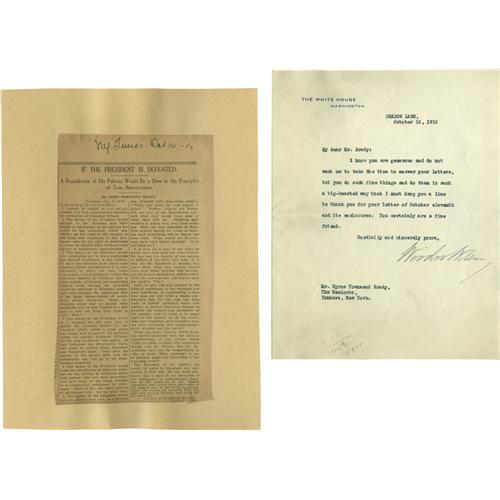 <B>Woodrow Wilson (1856-1924), President, Typed Letter Signed</B></I> "<I>Woodrow Wilson</B></I>" as President, one page on White House letterhead, 7" x 9", Shadow Lawn, October 16, 1916 to journalist Cyrus Townsend Brady (1861-1920) thanking him for the enclosure of his letter of support published in <I>The New York Times.</B></I> Wilson writes: "<I>My dear Mr. Brady: I know you are generous and do not want me to take the time to answer your letters, but you do such fine things and do them in such a big-hearted way that I must drop you a line to thank you for your letter of October eleventh and its enclosures. You certainly are a fine friend.</B></I>" Offered together with a retained and signed copy of Brady's original letter to Wilson, dated Yonkers, New York, October 11, 1916. The <I>Times</B></I> article was published on October 16, and was headlined "If the President is Defeated". Brady wrote in a fiery polemic that a defeat of Wilson by Charles Evans Hughes would in short "...give unbounded joy to every traitorous and disloyal hyphenate in the country..." Wilson narrowly won a second term in 1916 by stressing the fact that he had kept the nation out of war, and had managed to pressure the Germans to suspend unrestricted submarine warfare. This would not last of course, and after further attacks on American ships by German U-boats, Wilson asked Congress to declare war against Germany on April 2, 1917. Letter is overall quite clean with only minor soiling, overall fine condition. From the Henry E. Luhrs Collection.