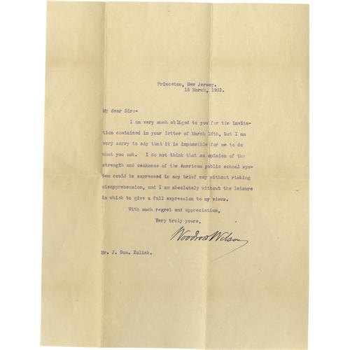 <B> Woodrow Wilson Typed Letter Signed </B></I> "<I>Woodrow Wilson.</B></I>" One page, typed letter, 8" x 10.5", dated March 18, 1903, from Princeton, Jersey. This letter was written to a Mr. J. Don. Zulick in West Chester, Pennsylvania. The letter was written to express Wilson's regret that he was unable to come give a speech about the public school system. It reads in part, "<I>I do not think that an opinion of the strength and weakness of the American public school system could be expressed in any brief way without risking misapprehension, and I am absolutely without the leisure in which to give a full expression to my views.</B></I>" This letter was written when Wilson was president of Princeton University. <BR><BR> In fine condition with no major flaws. The signature is in dark and bold letters, in blue ink. The letter comes with the original envelope. The paper itself is slightly yellowed, and has the expected folds. A great lot from Wilson's early political and academic career.