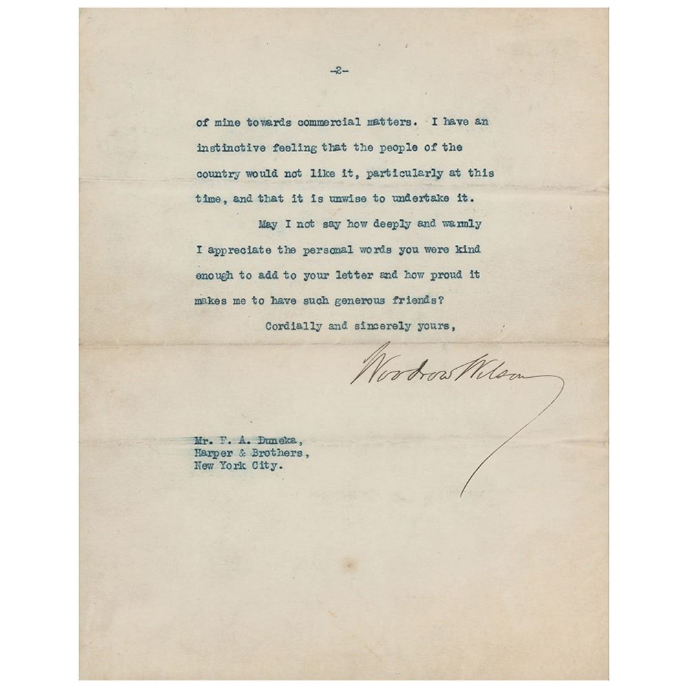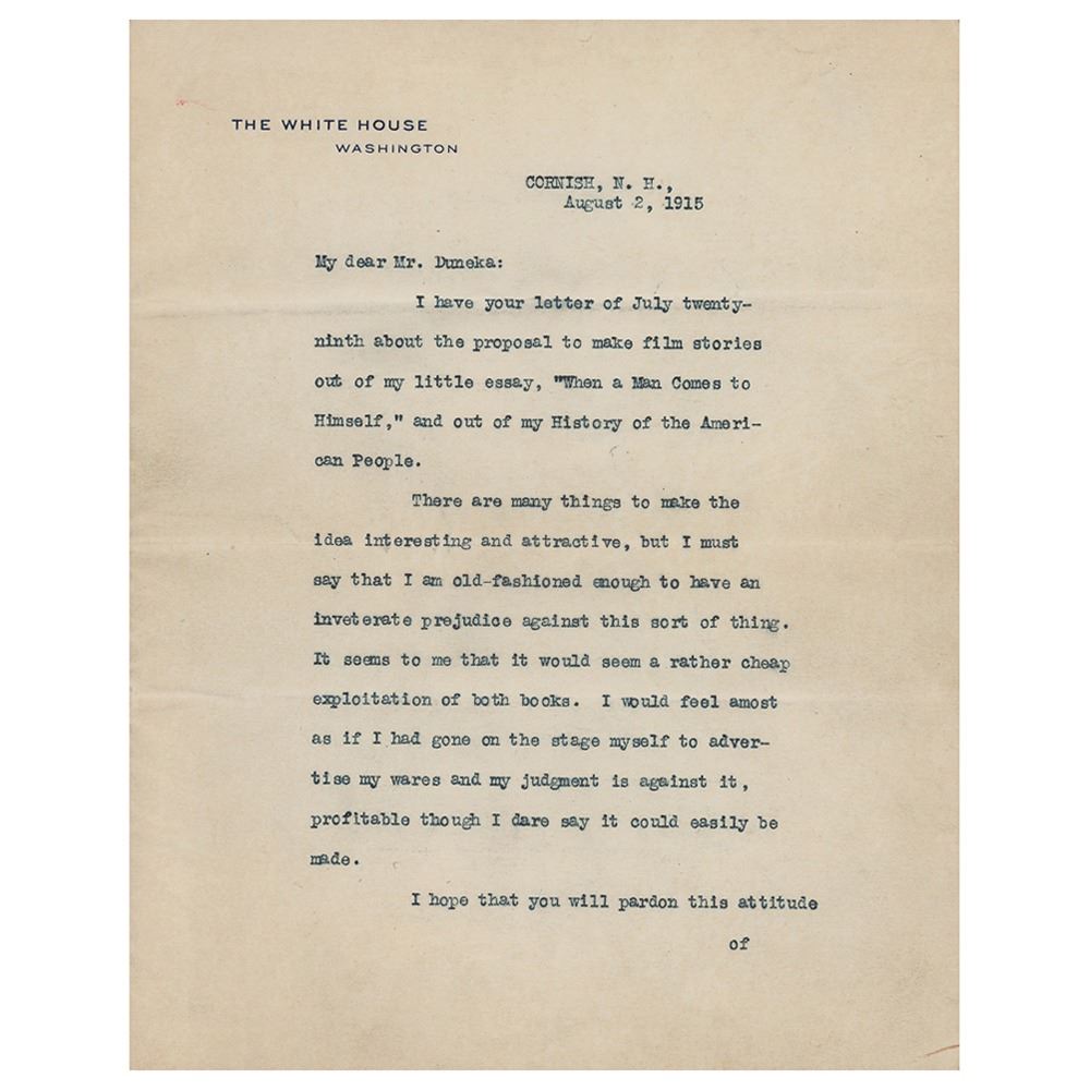 TLS as president, one page, 7 x 8.75, White House letterhead, August 2, 1915. Letter to F. A. Duneka of Harper & Brothers, responding to "the proposal to make film stories out of my little essay, 'When a Man Comes to Himself,' and out of my History of the American People." In part: "There are many things to make the idea interesting and attractive, but I must say that I am old-fashioned enough to have an inveterate prejudice against this sort of thing. It seems to me that it would seem a rather cheap exploitation of both books. I would feel almost as if I had gone on the stage myself to advertise my wares and my judgment is against it, profitable though I dare say it could easily be made. I hope that you will pardon this attitude of mine towards commercial matters. I have an instinctive feeling that the people of the country would not like it, particularly at this time, and that it is unwise to undertake it." In very good to fine condition, with two extra horizontal folds.