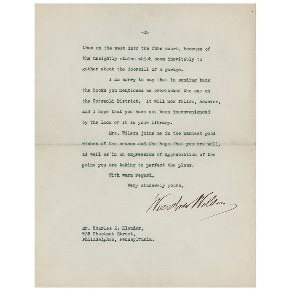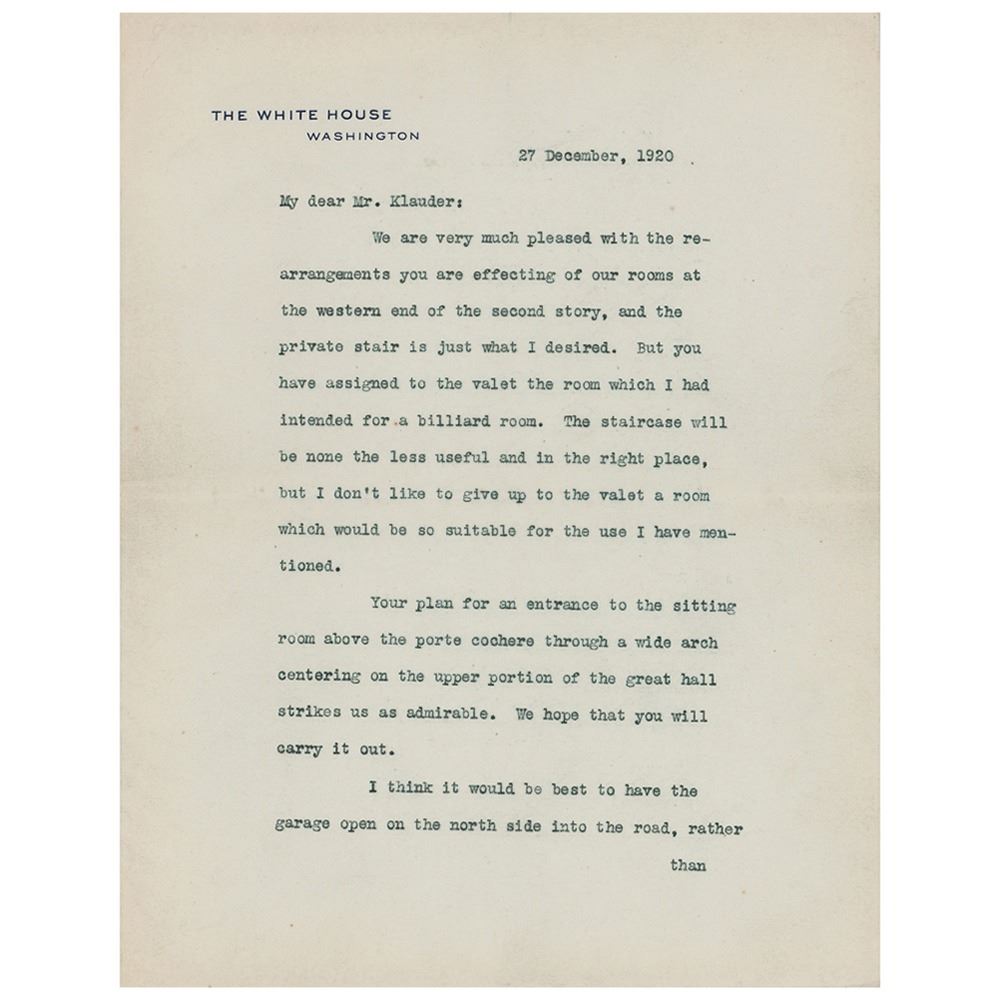 TLS as president, two pages, 7 x 8.75, White House letterhead, December 27, 1920. Letter to architect Charles Z. Klauder, best known for his 'Cathedral of Learning' at the University of Pittsburgh. In part: "We are very much pleased with the rearrangements you are effecting of our rooms at the western end of the second story, and the private stair is just what I desired. But you have assigned to the valet the room which I had intended for a billiard room. The staircase will be none the less useful and in the right place, but I don't like to give up to the valet a room which would be so suitable for the use I have mentioned. Your plan for an entrance to the sitting room above the porte cochere through a wide arch centering on the upper portion of the great hall strikes us as admirable. We hope that you will carry it out." In fine condition.