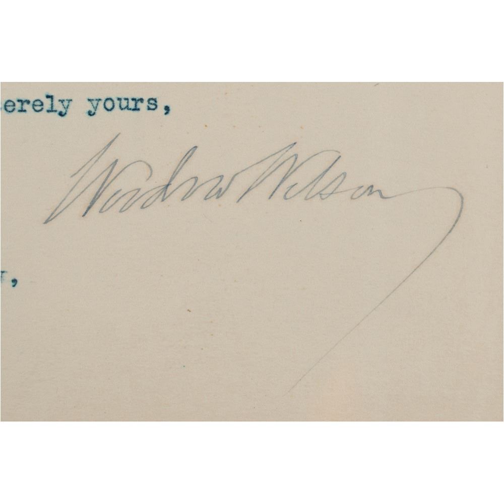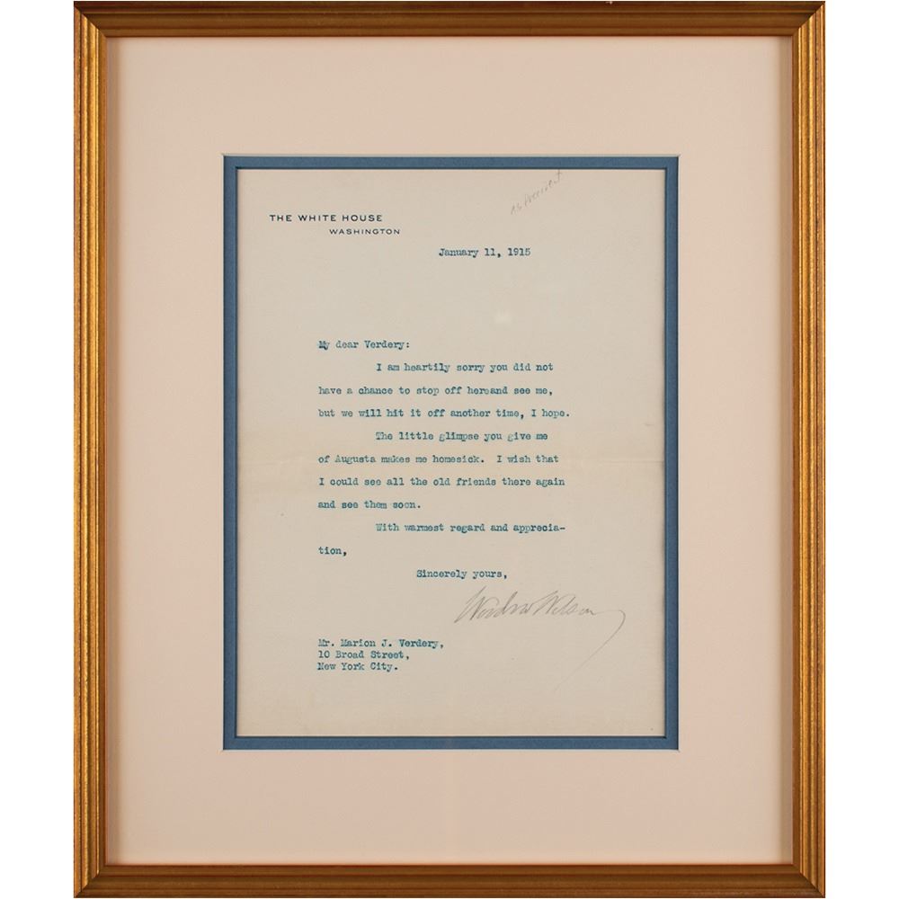 World War I-dated TLS, one page, 6.25 x 8.25, White House letterhead, January 11, 1915. Letter to Marion J. Verdery, in full: "I am heartily sorry you did not have a chance to stop off here and see me, but we will hit it off another time, I hope. The little glimpse you give me of Augusta makes me homesick. I wish that I could see all the old friends there again and see them soon." Archivally double-matted and framed to an overall size of 11 x 13. In fine condition. Accompanied by the original mailing envelope.