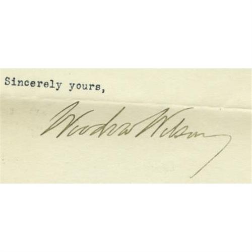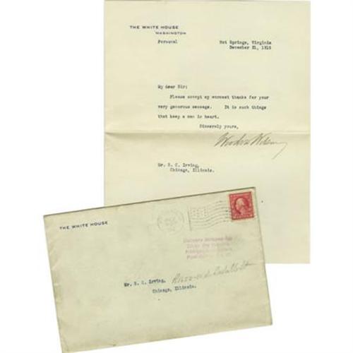 <B>Woodrow Wilson Typed Letter Signed as President</B></I> on White House letterhead marked "<I>Personal</B></I>", one page, 7" x 8.75", Hot Springs, Virginia, Dec. 31, 1915. A brief letter to a Mr. S.C. Irving of Chicago, Illinois: "<I>Please accept my warmest thanks for your very generous message. It is such things that keep a man in heart.</B></I>" Wilson had married Edith Galt on December 18, and is likely responding to congratulations received on his wedding. Accompanied by the original transmittal envelope. Near fine condition. <BR><BR><b>Shipping:</b> Flat Material, Small (<a target="_blank" href="http://www.heritageauctions.com/common/shipping.php">view shipping information</a>)
