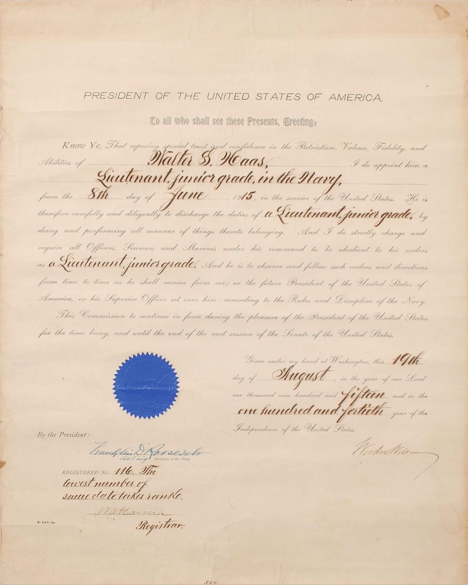 Uncommon partly-printed DS as president, one page, 16 x 20, August 19, 1915. President Wilson appoints Walter S. Haas as “Lieutenant, junior grade, in the Navy.” Signed at the conclusion by Wilson, and countersigned in blue fountain pen by Franklin D. Roosevelt as secretary of the navy, adding “Acting” to his title. Embossed blue naval seal affixed to left remains intact. Rolled and in very good condition, with scattered overall creasing. An appealing combination of the two American leaders, and just the third instance we have ever offered such a Wilson/Roosevelt document.
