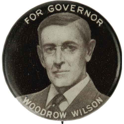 <B>Very Rare, Early Woodrow Wilson for New Jersey Governor 7/8" Button.</B></I> One of only several known examples, this is a key button for presidential and New Jersey governor collectors alike. Unusual youthful portrait contrasts nicely with deep black background to create a very striking appearance. Choice condition.