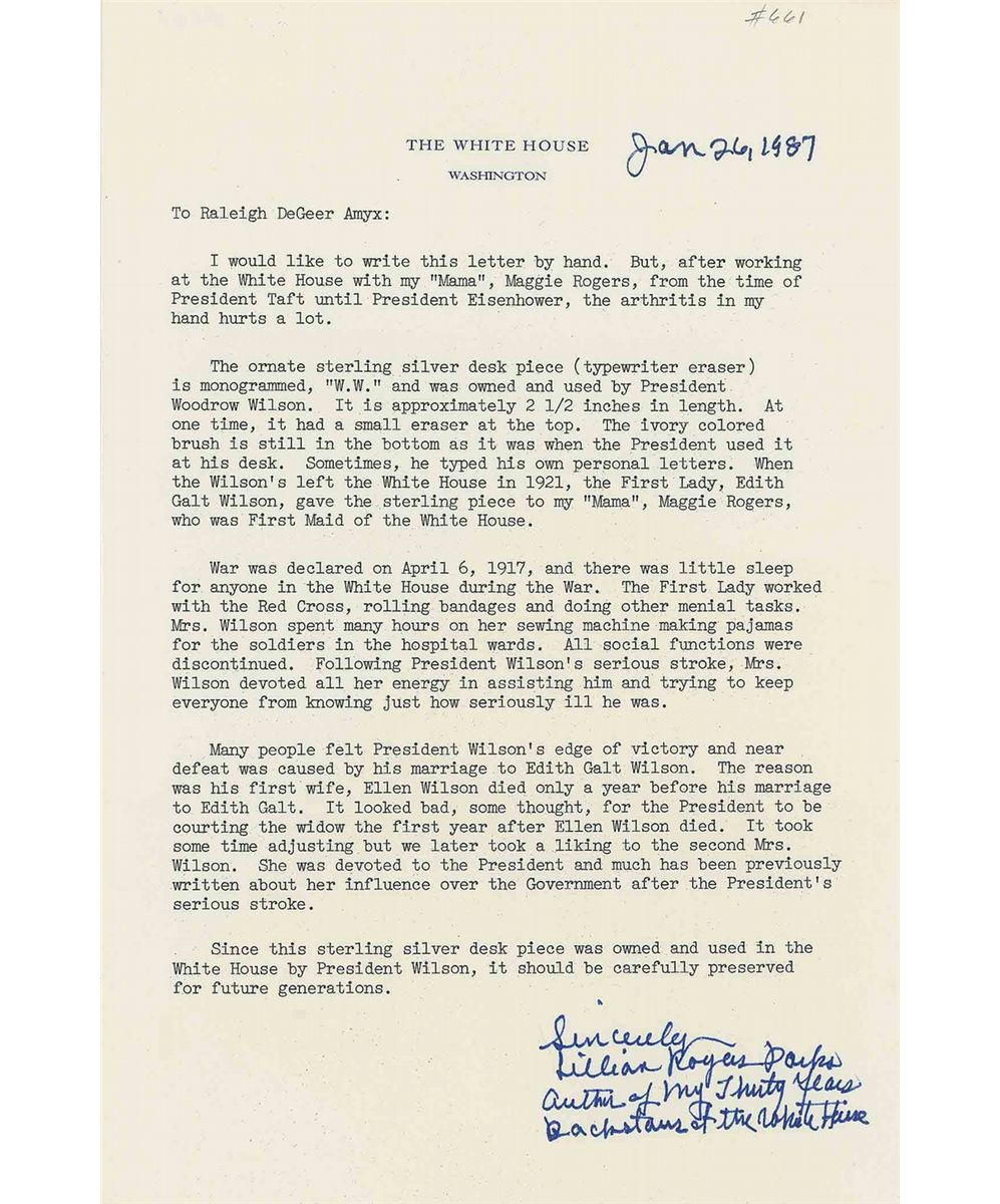 President Wilson’s personally-owned and -used ornate silver typewriter eraser brush, measuring 1 x 2.75, featuring a beautiful ornate handle engraved in the domed center with his initials, “W. W.,” which holds the brush’s horsehair bristles and topped with a rubber eraser. Includes a detailed letter of provenance on White House letterhead from best selling author, Lillian Rogers Parks, who was a housekeeper and seamstress at the White House for over 30 years, from Hoover through Eisenhower. In part: “I would like to write this letter by hand. But, after working at the White House with my ‘Mama,’ Maggie Rogers, from the time of President Taft until President Eisenhower, the arthritis in my hand hurts a lot. The ornate sterling silver desk piece (typewriter eraser) is monogrammed, "W.W." and was owned and used by President Woodrow Wilson…At one time, it had a small eraser at the top. The ivory colored brush is still in the bottom as it was when the President used it at his desk. Sometimes, he typed his own personal letters. When the Wilsons left the White House in 1921, the First Lady, Edith Galt Wilson, gave the sterling piece to my 'Mama,' Maggie Rogers, who was First Maid of the White House…This sterling silver desk piece was owned and used in the White House by President Wilson." Based on Parks's description, the eraser atop the handle seems to be a replacement, though of the same period. Wilson was extremely fond of his typewriter—he purchased a Hammond while president of Princeton University, which he referred to as his 'pen.' It was this typewriter—with the innovative ability to change fonts—that he took with him to the White House, where he went on to use a number of different Hammonds, his brand of choice. The legacy of Wilson's typewriter lived on into the 1960s, when President John F. Kennedy was presented with the typewriter that Wilson used to write the '14 Points' speech. This exceptional monogrammed presidential relic is of great historical interest as it is intimately associated with Wilson's work as president.