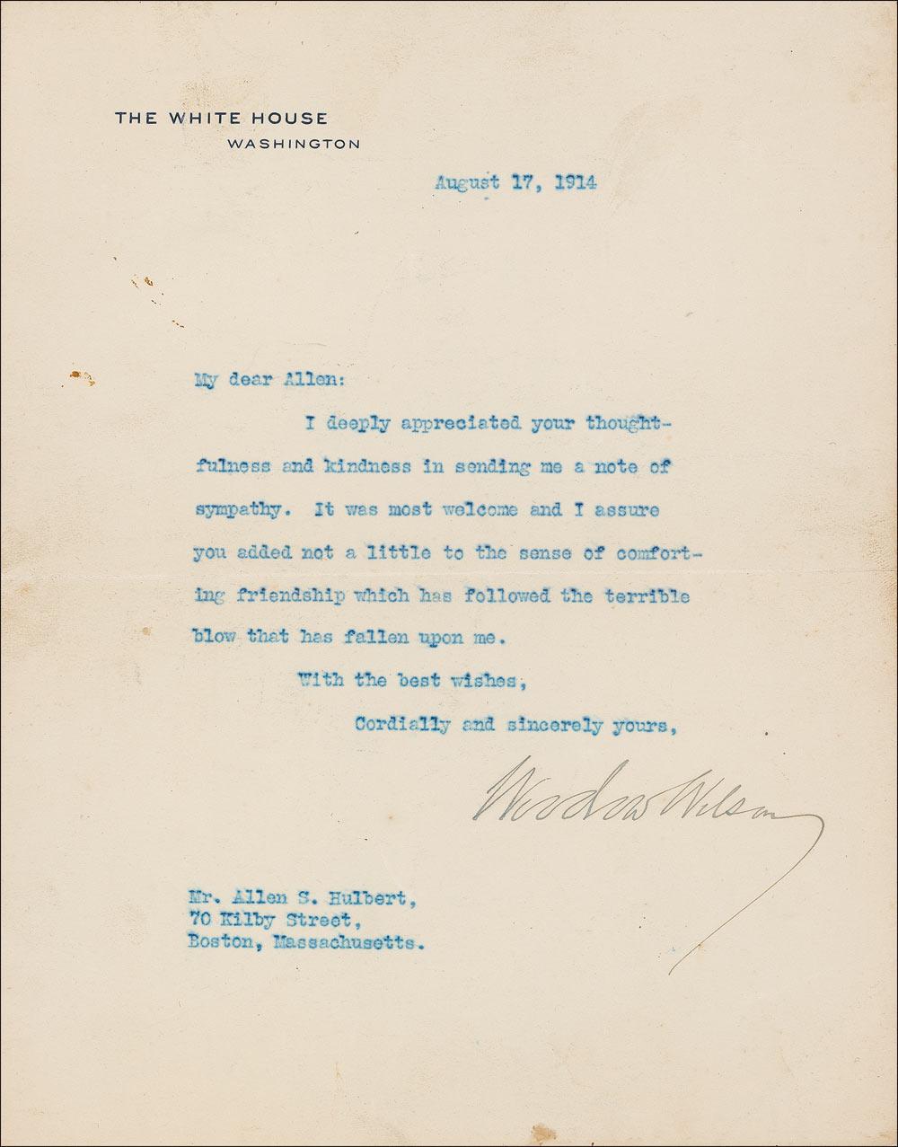 TLS as president, one page, 7 x 9, White House letterhead, August 17, 1914. Letter to Allen S. Hulbert, the son of his longtime friend Mary Allen Hulbert Peck, written shortly after the passing of his first wife Ellen. In full: “I deeply appreciated your thoughtfulness and kindness in sending me a note of sympathy. It was most welcome and I assure you added not a little to the sense of comforting friendship which has followed the terrible blow that has fallen upon me.” In very good condition, with scattered toning and soiling. An interesting letter to the son of Wilson’s rumor-inspiring ‘playmate”: the third most important woman in his life, and a threat to both his wives and his campaigns.