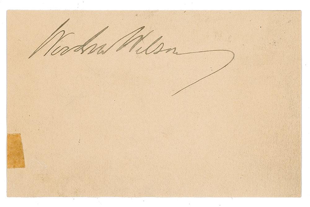 Fountain pen signature on a tan 4.25 x 2.75 card. In very good condition, with scattered areas of trivial soiling, small bit of adhesive to the lower left margin, and adhesive residue on much of the reverse from a previous mounting.