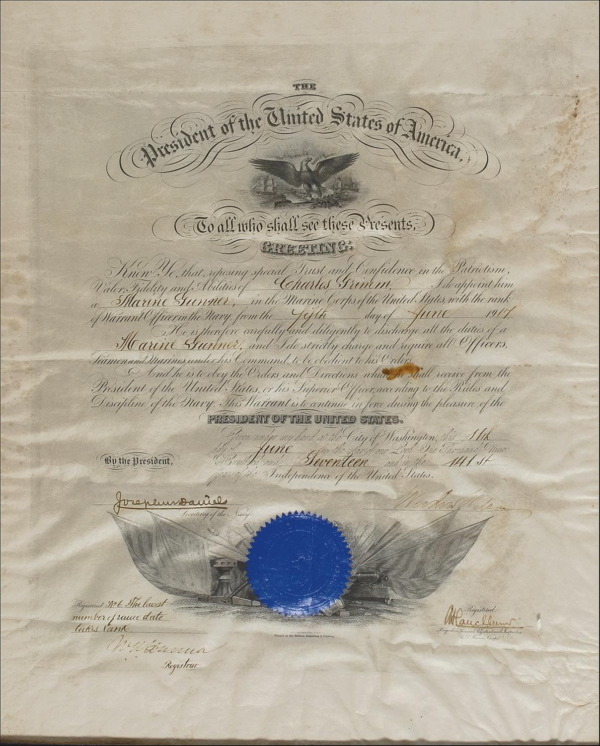 Partly-printed DS as president, one page, 15 x 18, June 11, 1917. President Wilson appoints Charles Grimm “a Marine Gunner in the Marine Corps of the United States.” Signed at the conclusion by Wilson, and countersigned by Secretary of the Navy, Josephus Daniels. Framed to an overall size of 16 x 19.5. Mild overall rippling, some lightly affecting signature, document slightly shifted in frame, and scattered toning and soiling, otherwise very good condition.