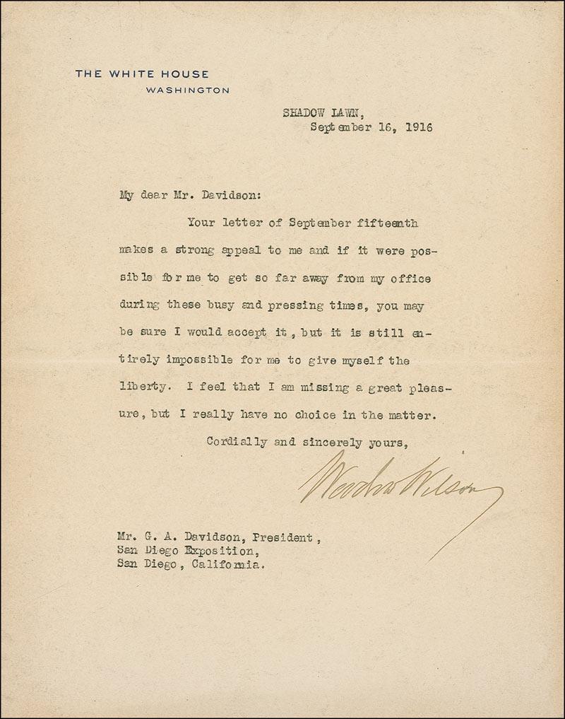 TLS as president, one page, 7 x 9, White House letterhead, September 16, 1916. Letter to the president of the San Diego Exposition declining an invitation. In full: “Your letter of September fifteenth makes a strong appeal to me and if it were possible for me to get so far away from my office during these busy and pressing times, you may be sure I would accept it, but it is still entirely impossible for me to give myself the liberty. I feel that I am missing a great pleasure, but I really have no choice in the matter.” Letter is affixed to a slightly larger black scrapbook page. In fine condition, with a uniform shade of toning.