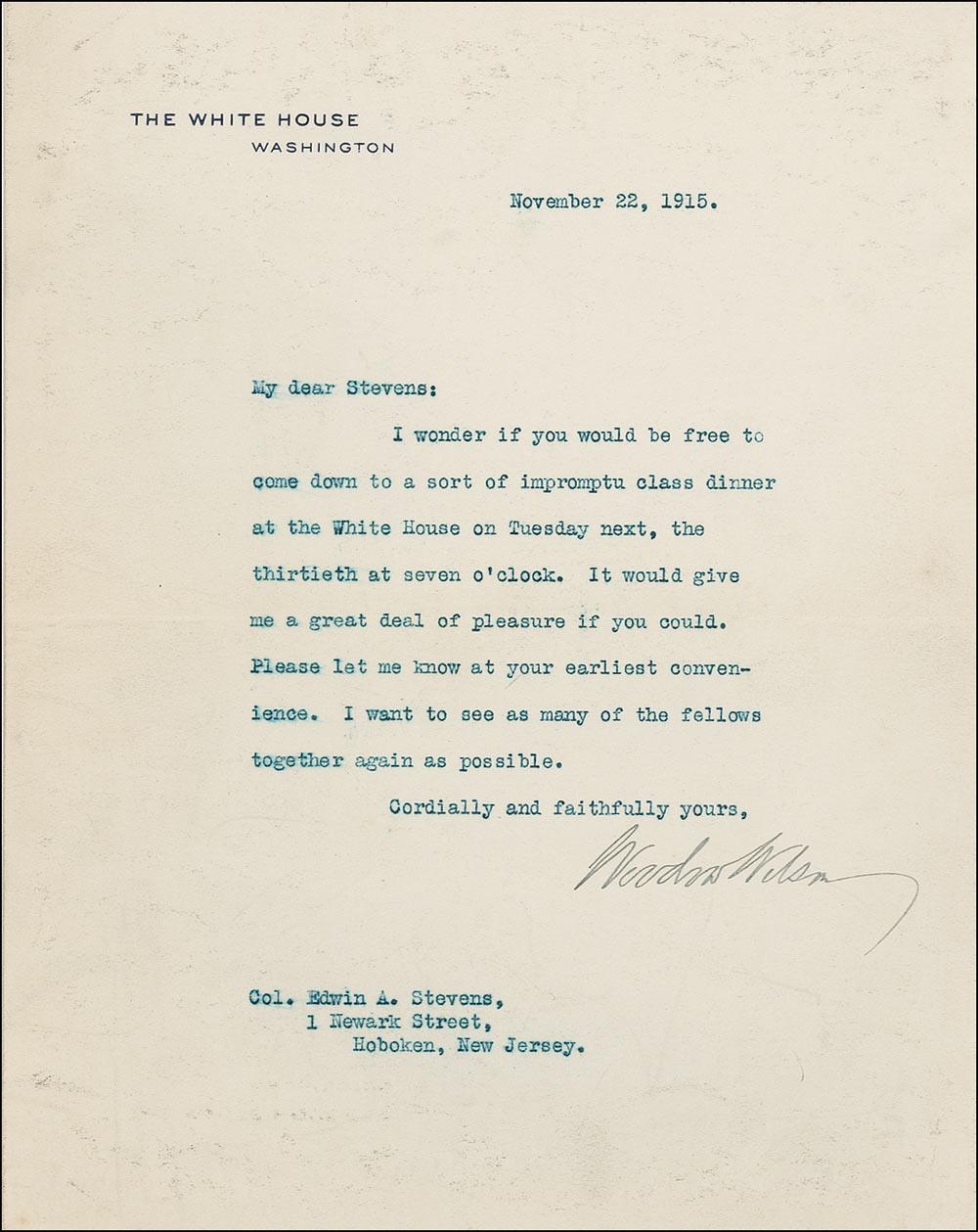 TLS as president, one page, 7 x 9, White House letterhead, November 22, 1915. Letter of invitation to Colonel Edwin Stevens. In part: “I wonder if you would be free to come down to a sort of impromptu class dinner at the White House on Tuesday next…It would give me a great deal of pleasure if you could…I want to see as many of the fellows together as possible.” Scattered soiling and light surface marks, otherwise fine condition.
