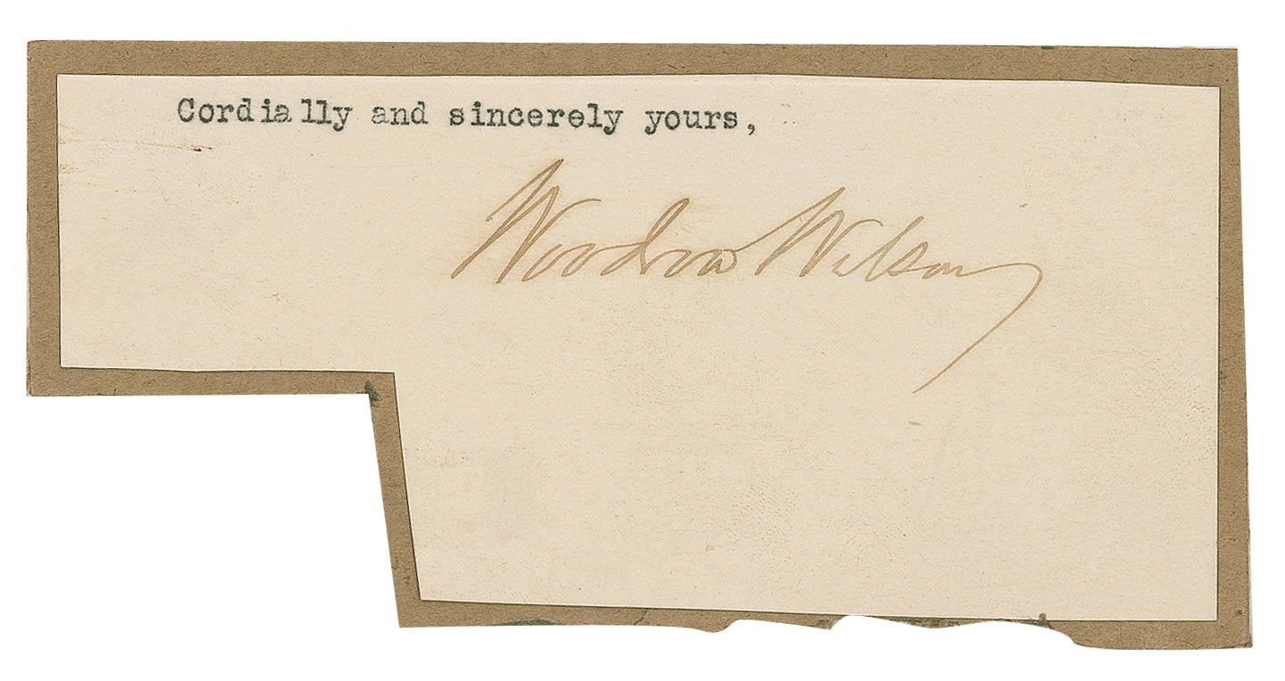 Ink signature, “Woodrow Wilson,” on an off-white irregularly clipped slip, taken from the closing of a letter, and affixed to a similar size piece of corrugated cardboard. Uniform mild toning, paperclip impression to left edge, and some mild haloing to signature, otherwise fine condition.