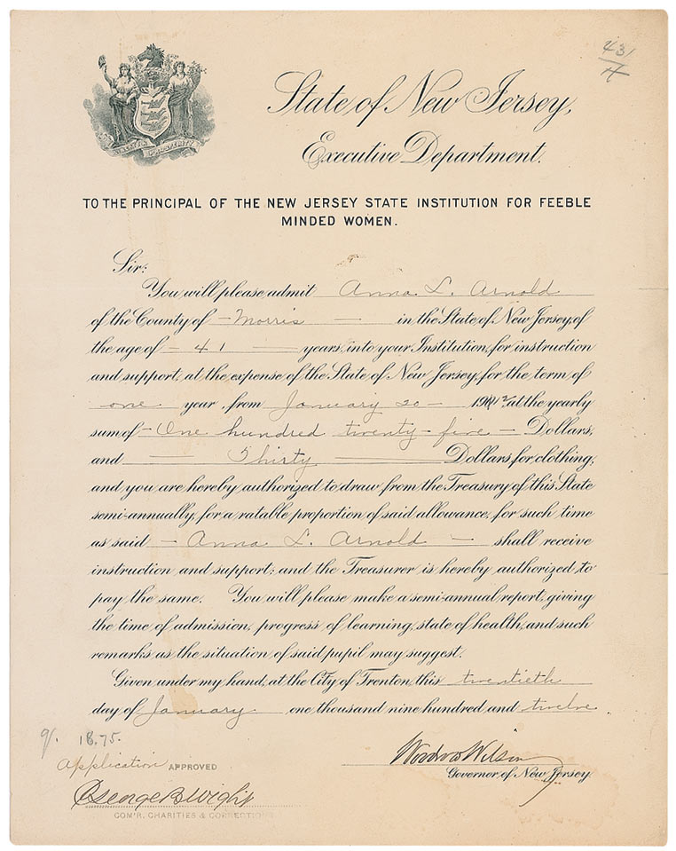 DS, one page, 9 x 11.5, January 20, 1912. Wilson, as governor of New Jersey, sends a woman to the “New Jersey State Institution for Feeble Minded Women.” In part: “You will please admit Anna L. Arnold…the age of 41 years into your Institution for instruction and support at the expense of the State of New Jersey for the term of one year…at the yearly sum of one hundred twenty five Dollars for clothing and you are hereby authorized to draw from the Treasury of this State semi-annually for a ratable portion of said allowance for such time as said Anna L. Arnold shall receive instruction and support…You will please make a semi-annual report giving the time of admission, progress of learning, state of health, and such remarks as the situation of said pupil may suggest.” In very good condition, with a few small separations along intersecting folds, scattered light damp staining, some lightly affecting portions of signature, uniform toning, a couple of pencil notations, and scattered pin holes.