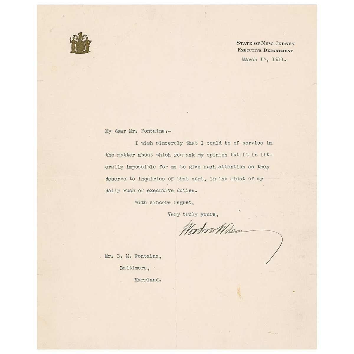 TLS, one page, 8 x 9.75, State of New Jersey letterhead, March 17, 1911. Wilson politely declines comment. In full, “I wish sincerely that I could be of service in the matter about which you ask my opinion but it is literally impossible for me to give such attention as they deserve to inquiries of that sort, in the midst of my daily rush of executive duties.” Intersecting mailing folds, some light soiling and a staple hole to top left, otherwise fine condition.