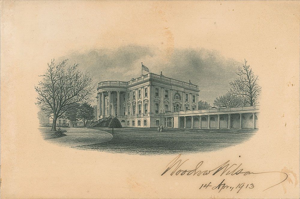 Unusual and nicely detailed engraved portrait of the exterior of the White House, 6 x 4, signed at the bottom in black ink, as president, “Woodrow Wilson 14 Apr. 1913.” In very good condition, with scattered toning and a few light stains, one next to signature.