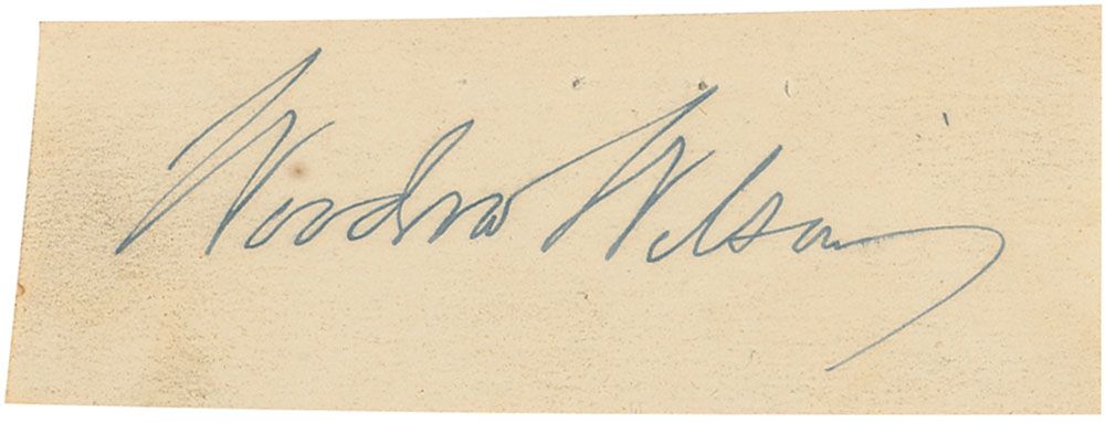 Ink signature, “Woodrow Wilson,” on an off-white 3.5 x 1.25 slip. A couple staple holes above signature and some scattered light toning and soiling, otherwise fine condition. Accompanied by an unsigned booklet entitled War Speeches and Addresses of Woodrow Wilson.