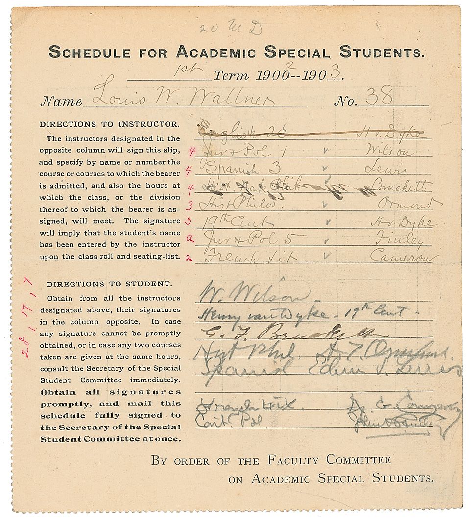DS, signed “W. Wilson,” one page, 5.5 x 6, no date. Schedule for Academic Special Students for the first term of the 1902–1903 school year at Princeton University for the student Louis W. Wallner. Document features a handwritten list of classes and the corresponding professors, with Wilson signing off on “Pol. 1.” The reverse features a week day grid, with various classes penned into the corresponding days. In very good condition, with a central horizontal fold, uniform toning, and a few ink and pencil notations.