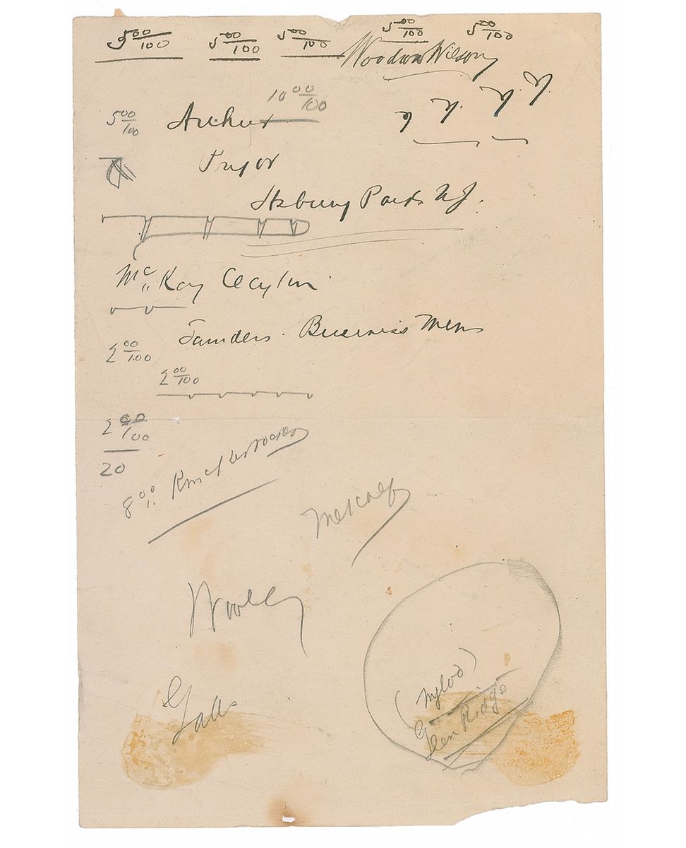Ink signature on an off-white 5.25 x 8 sheet. Scattered creasing, notes and doodles in another hand lightly affecting the signature, and two adhesive remnants to the bottom corners, otherwise very good condition.