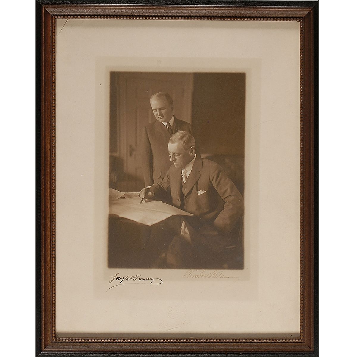 Vintage matte-finish 9.5 x 12.5 photo of Wilson going over a document with his private secretary Joseph P. Tumulty, by Edmonston of Washington, D. C., signed under the image in fountain pen, “Woodrow Wilson,” and “Joseph Tumulty.” Framed to an overall size of 11 x 14.25. In fine condition, with a diagonal tear to top left corner tip.